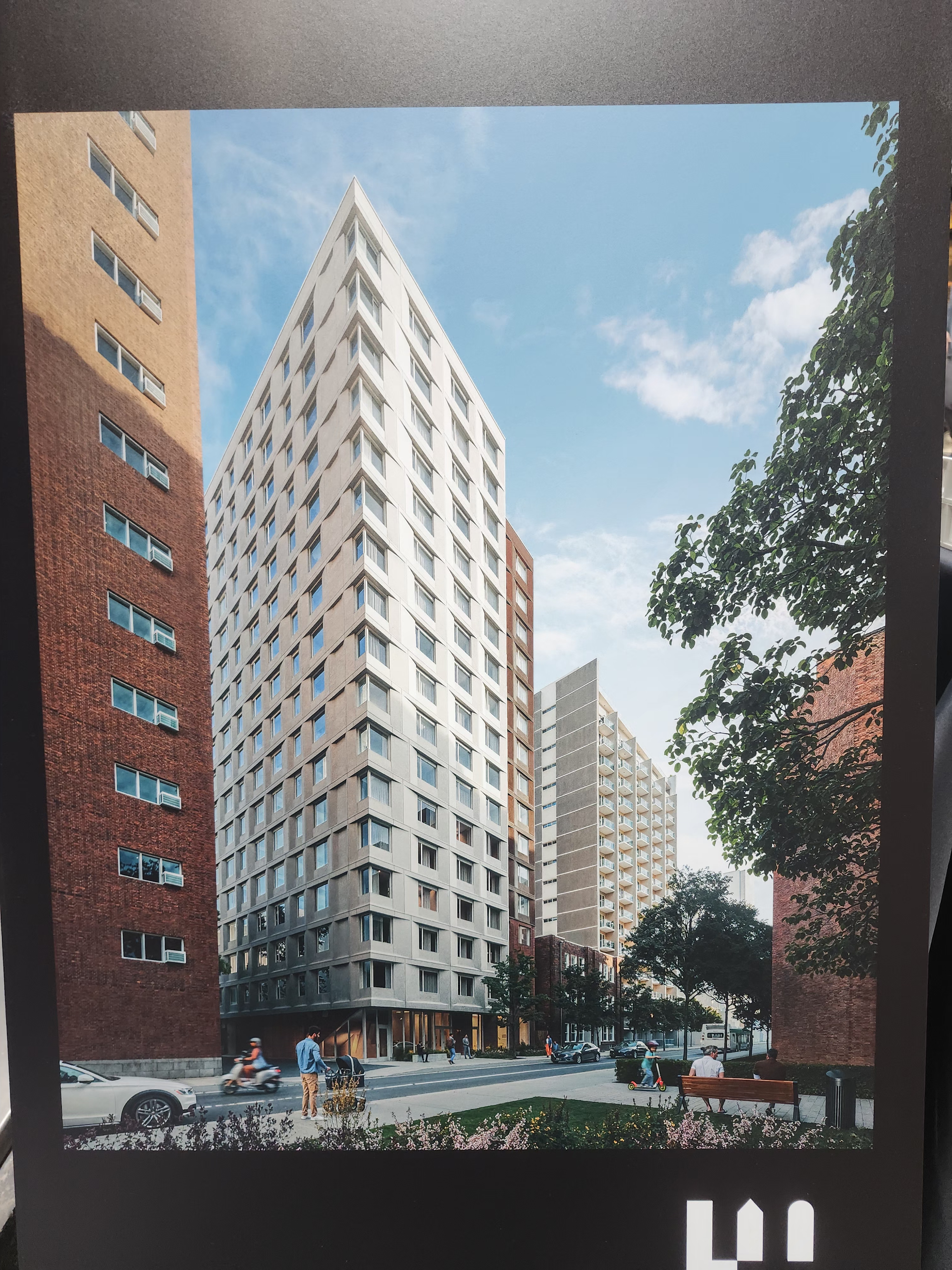 Utile nous indique que les panneaux de béton du Ace Hotel intègrent de véritables briques ou briquellettes, ce qui entraîne une hausse significative des coûts. En effet, cela implique l’ajout de deux types de revêtements extérieurs distincts, en plus de moules plus complexes pour la fabrication des panneaux de béton. Une telle augmentation des coûts rendrait la réalisation d’un projet de logements abordables irréalisable. Dans le concept actuellement proposé, Utile parvient à offrir un bâtiment de grande qualité architecturale tout en respectant les contraintes budgétaires liées à l’abordabilité. Le choix d’un revêtement en panneaux de béton préfabriqué a été fait dès les premières étapes du projet, en remplacement de la brique. Cette décision permet notamment de réduire les nuisances liées à la pose du revêtement, celle-ci étant plus rapide et nécessitant moins d’espace au sol - un avantage important pour un projet situé sur un petit terrain, dans un secteur résidentiel dense. Il est important de souligner que le concept général inclut tout de même l’utilisation de la brique au niveau du basilaire, du côté droit du bâtiment. Ce geste vise à établir un lien avec le patrimoine bâti du quartier, constitué d’immeubles de plus faible hauteur. En contraste, la tour, qui correspond aux étages supérieurs, adopte une approche plus contemporaine, assumant pleinement l’usage du béton. Travailler le béton pour ce qu’il est, en mettant en valeur sa texture et les jeux d’ombre créés par les angles intégrés aux panneaux, constitue un élément central du concept. Cette texture confère au bâtiment une apparence plus aérienne, légère et douce, tout en atténuant l’effet de masse que la brique aurait pu accentuer.