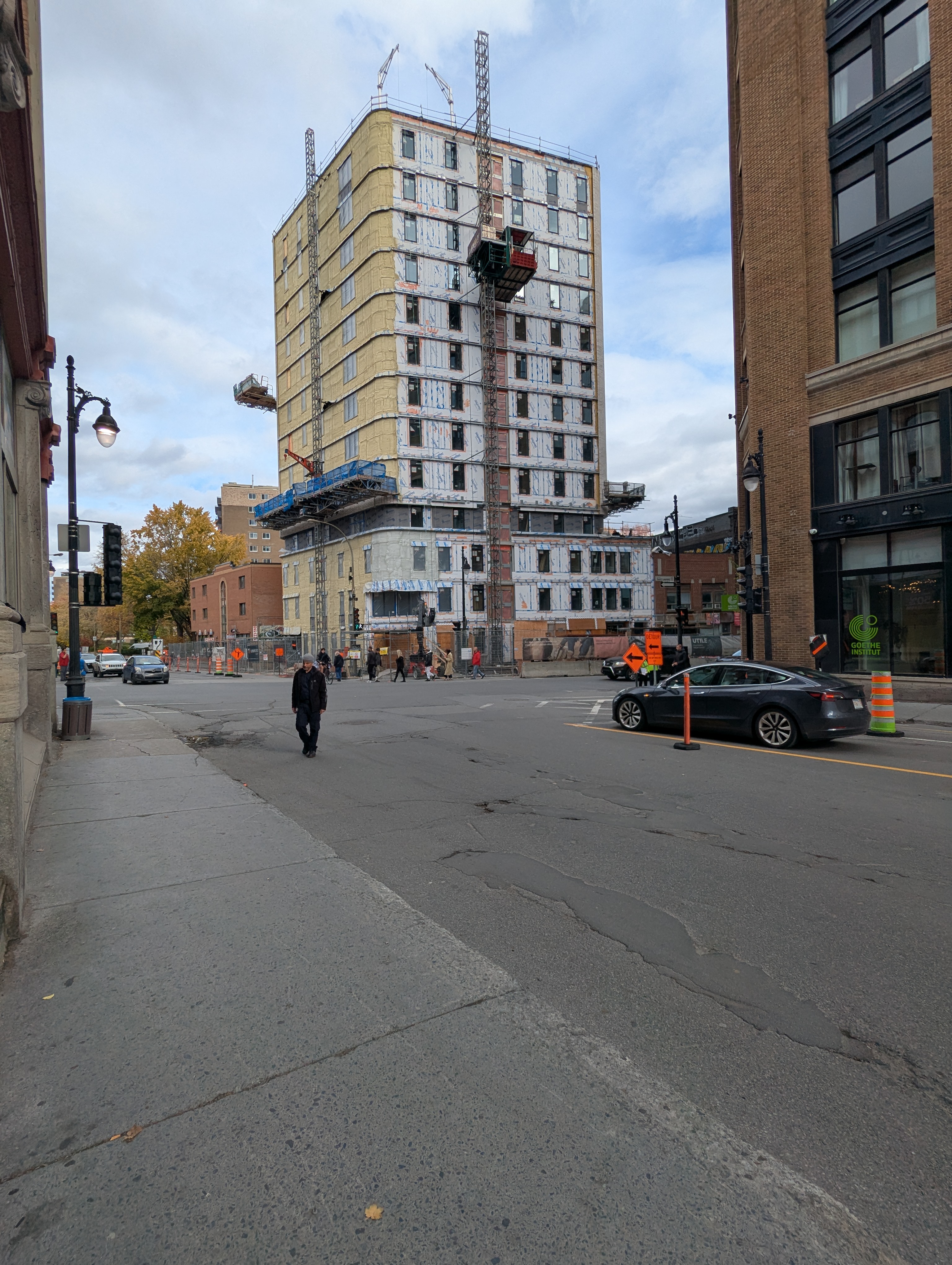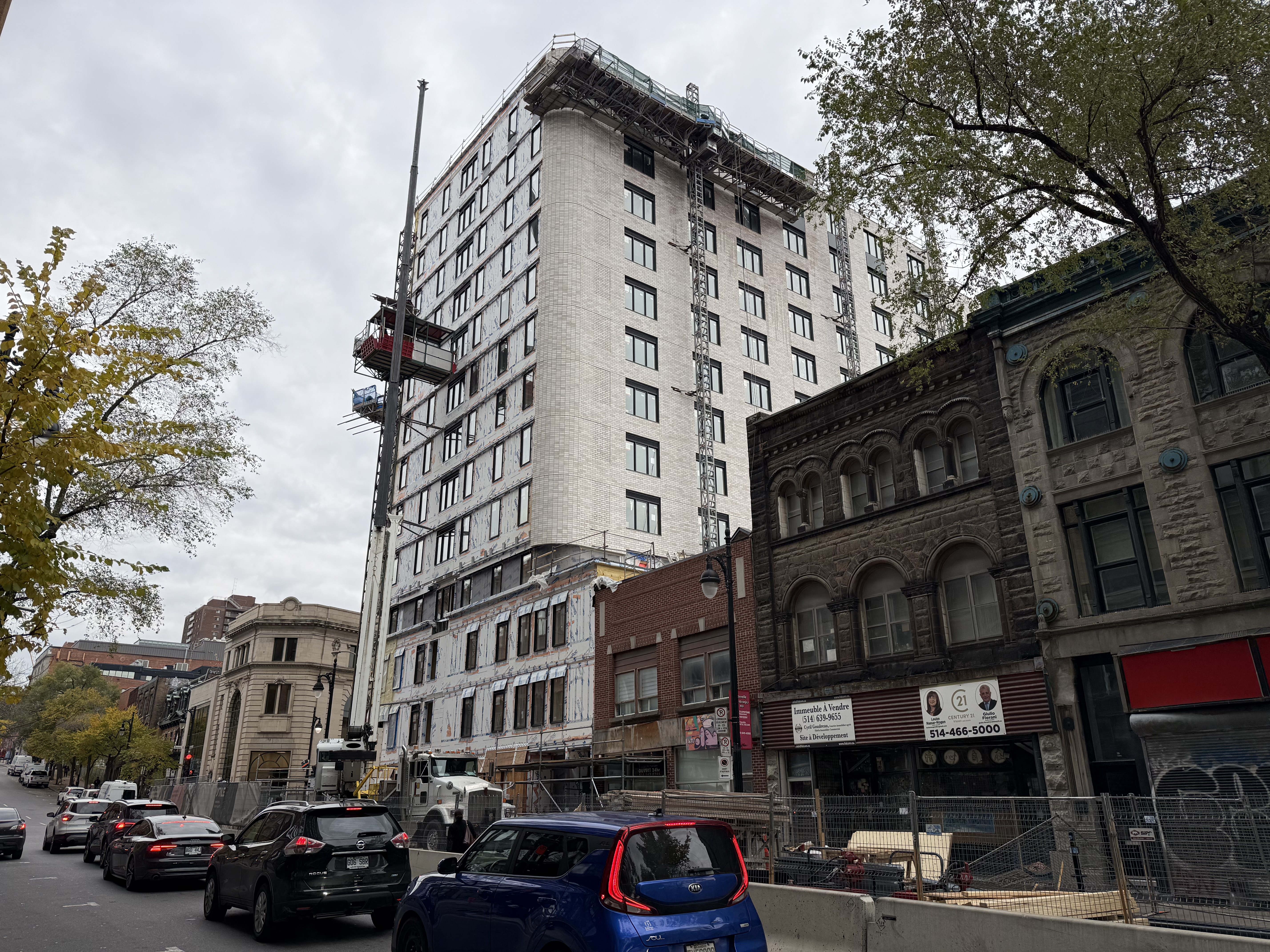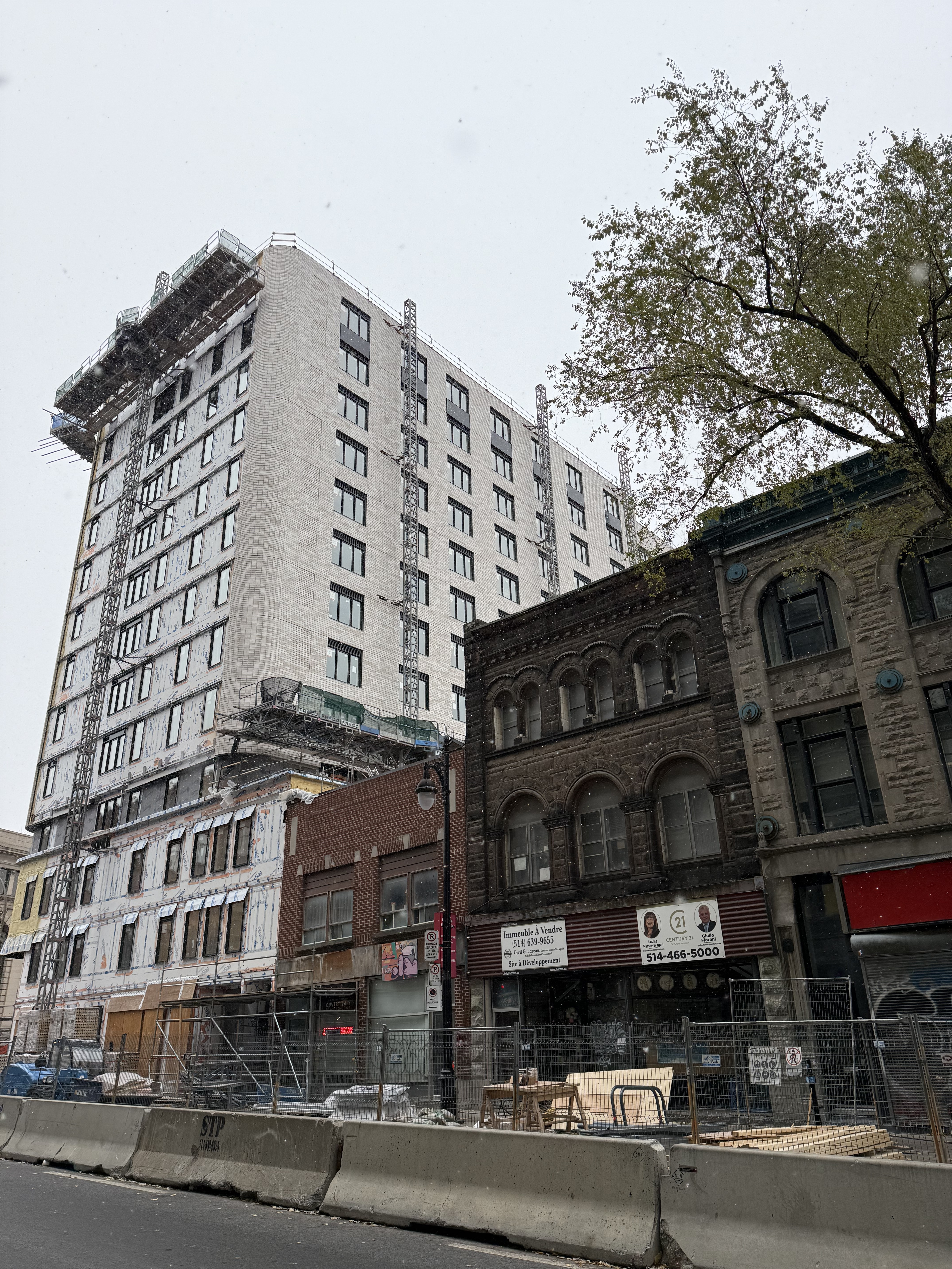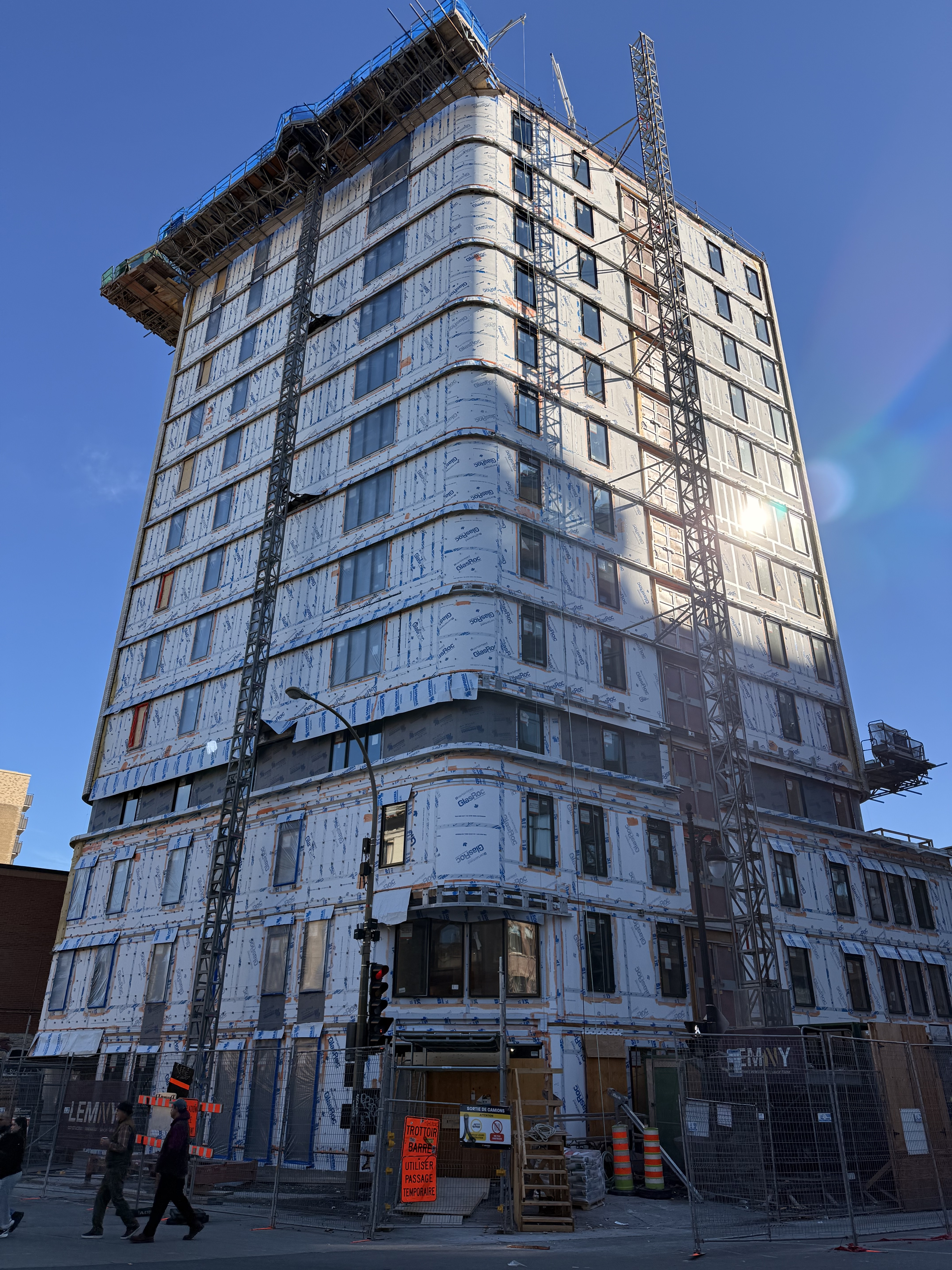 Elle est plutôt intéressante en vrai. Pas trop monotone, et elle est plutôt du côté chaud que froid, comme teinte. C’est sûr qu’on reste dans le gris, mais sur St-Laurent ça permet de ne pas trop assombrir, et dans le paysage environnant ça ne sera pas une masse écrasante. En plus un effort a quand même été fait par rapport aux appareillages.
