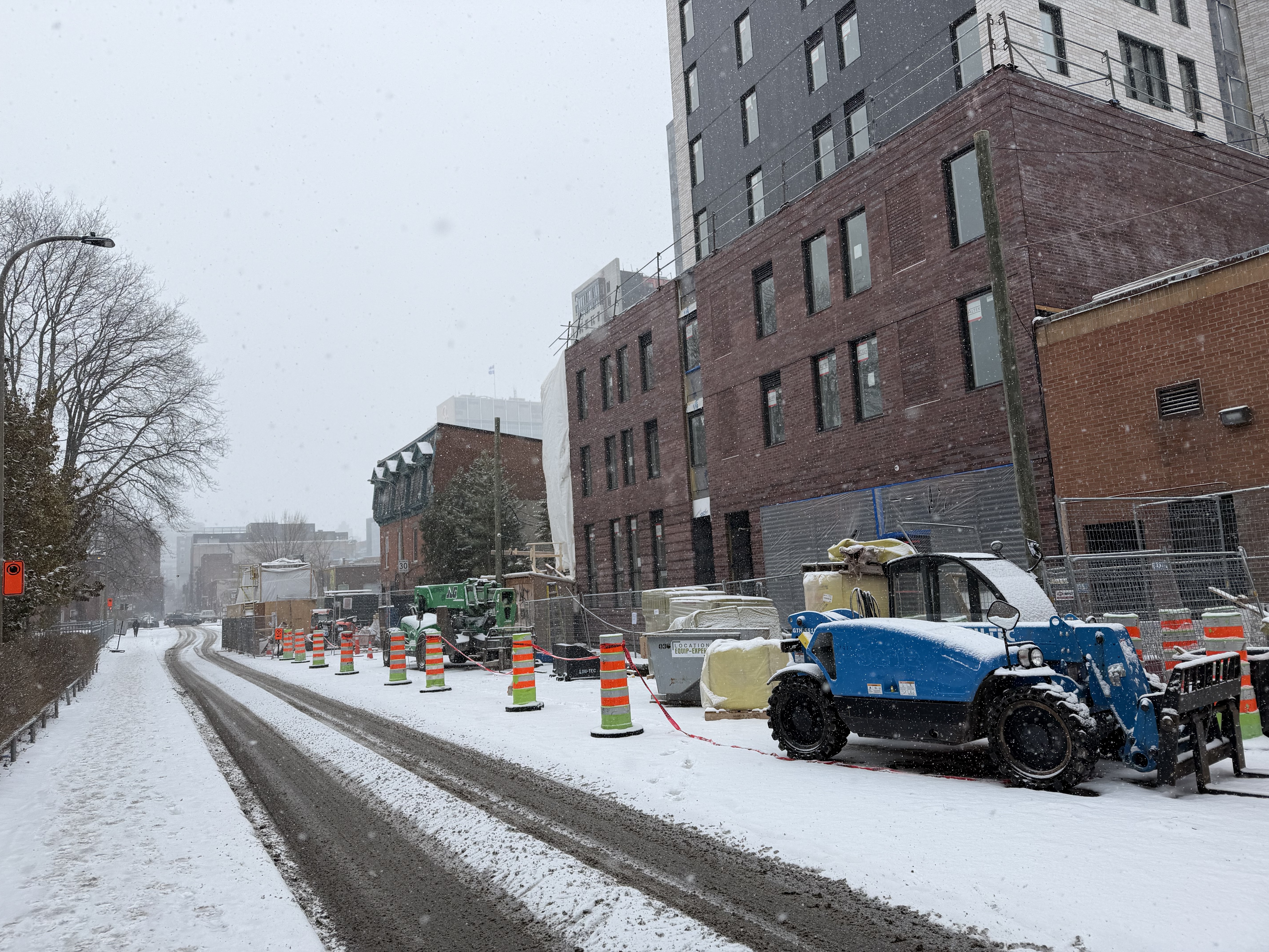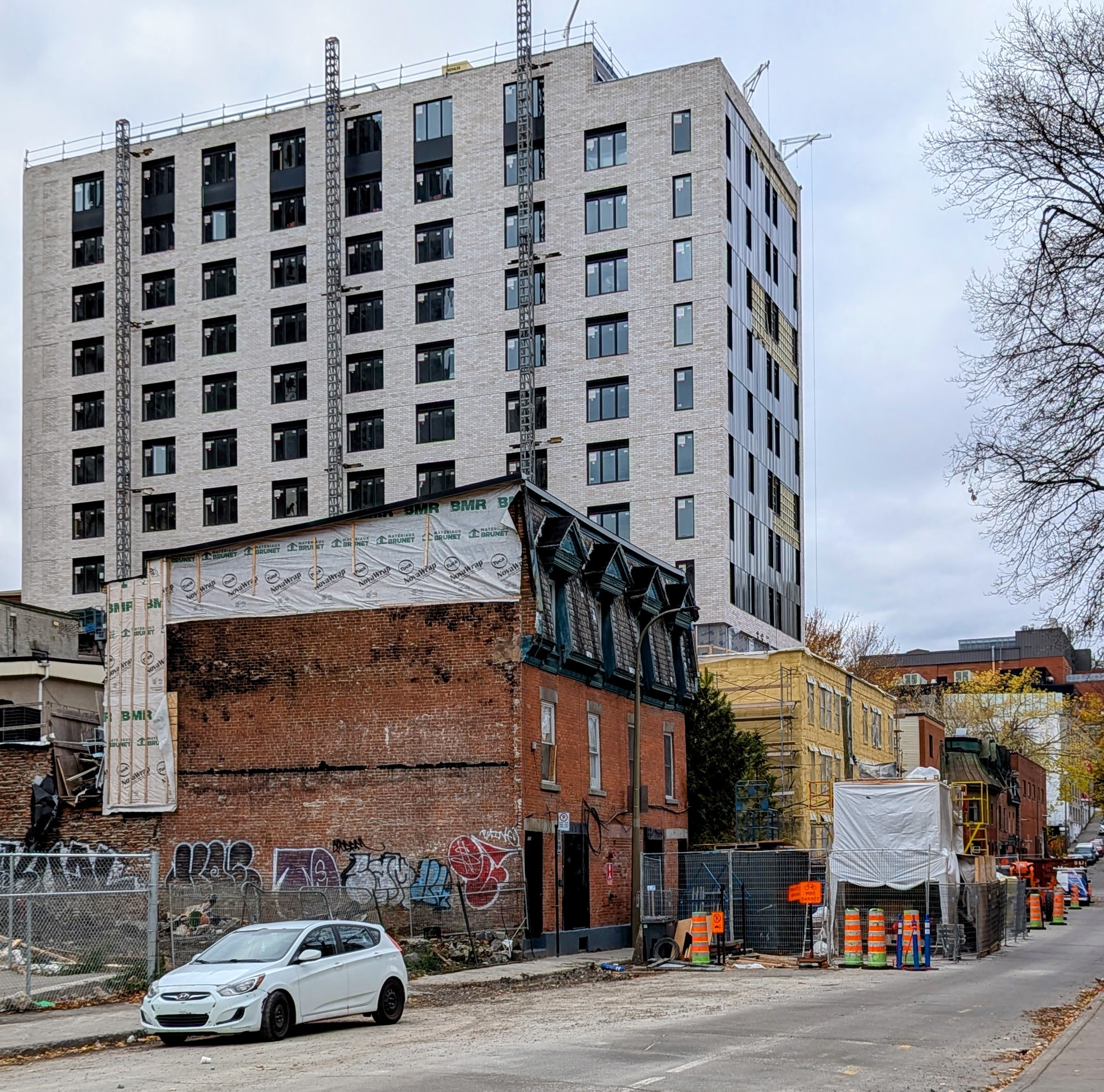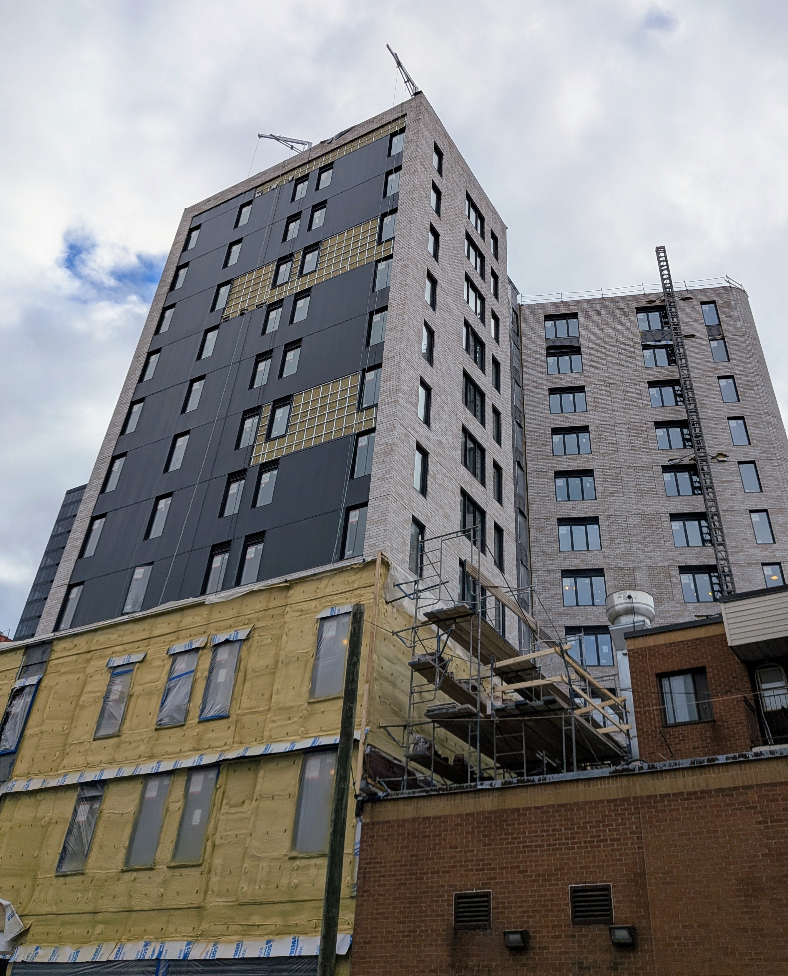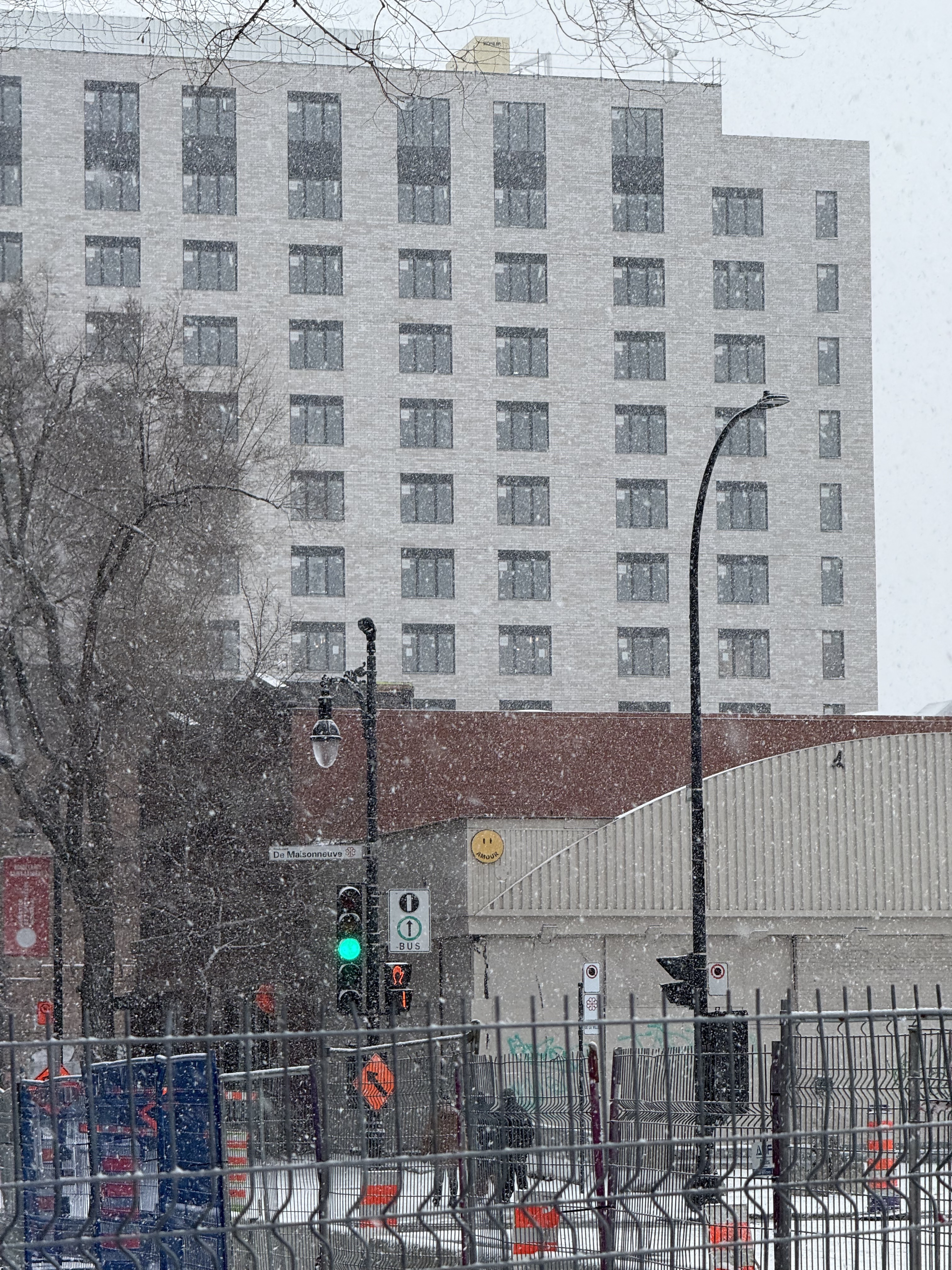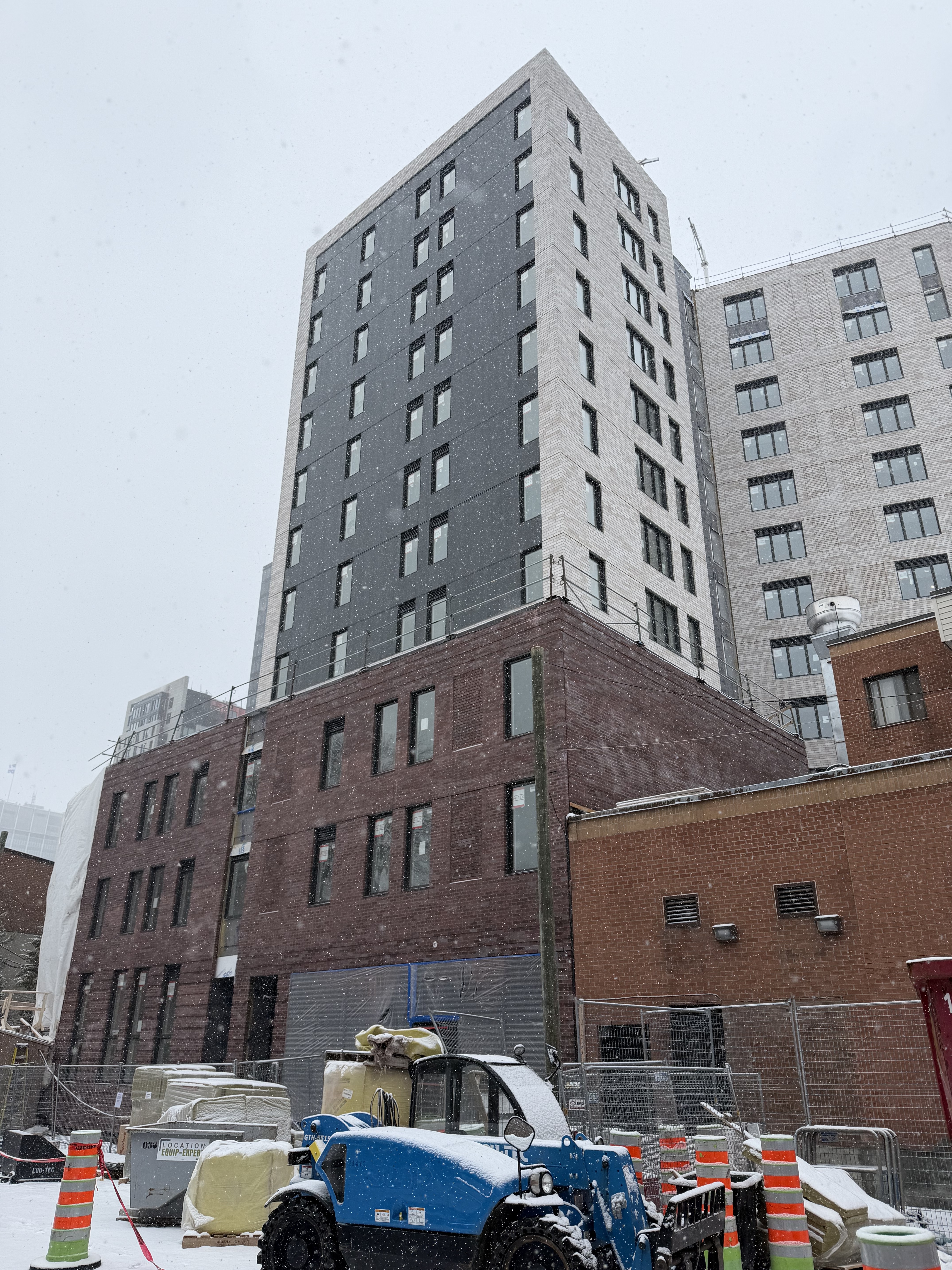 Elle est plutôt intéressante en vrai. Pas trop monotone, et elle est plutôt du côté chaud que froid, comme teinte. C’est sûr qu’on reste dans le gris, mais sur St-Laurent ça permet de ne pas trop assombrir, et dans le paysage environnant ça ne sera pas une masse écrasante. En plus un effort a quand même été fait par rapport aux appareillages.