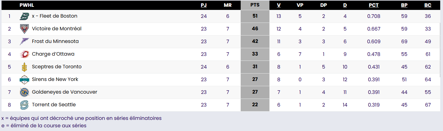 Montréal se trouve maintenant à deux points de Boston, premier au classement, et à six points devant le Minnesota, qui s’est incliné en prolongation contre New York ce soir. Avec le gain de New York, Vancouver accuse maintenant un retard de deux points sur les Sirens, sixièmes.