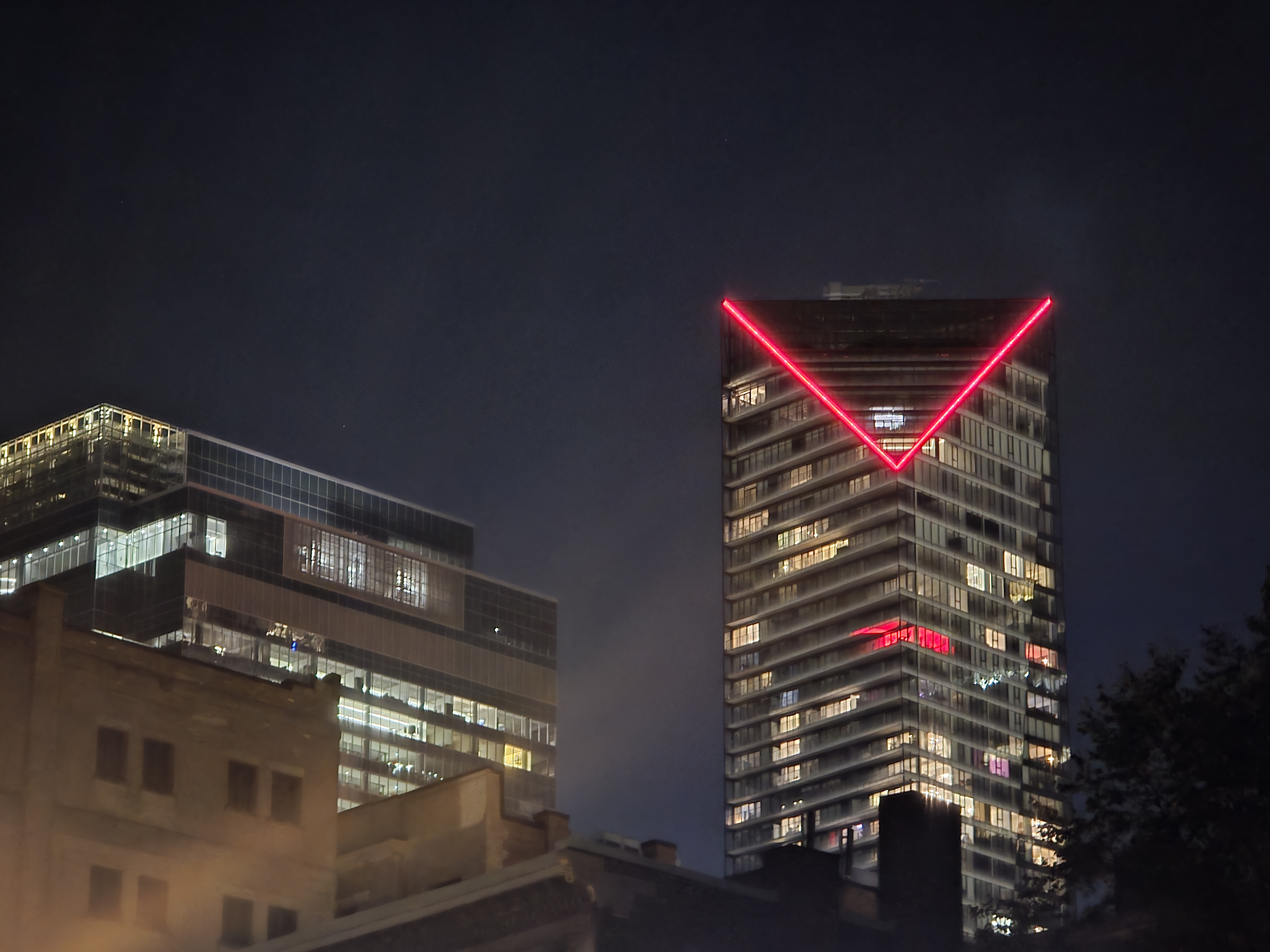 Et si le “V” devenait un “M”? Vu du parc Jean-Drapeau ou du pont Jacques-Cartier, le “V” de la tour est très visible sur la “skyline” montréalaise. Et comme la Biosphère, le pont Champlain, le pont Jacques-Cartier, il change de couleurs au gré des événements qui animent la Ville.