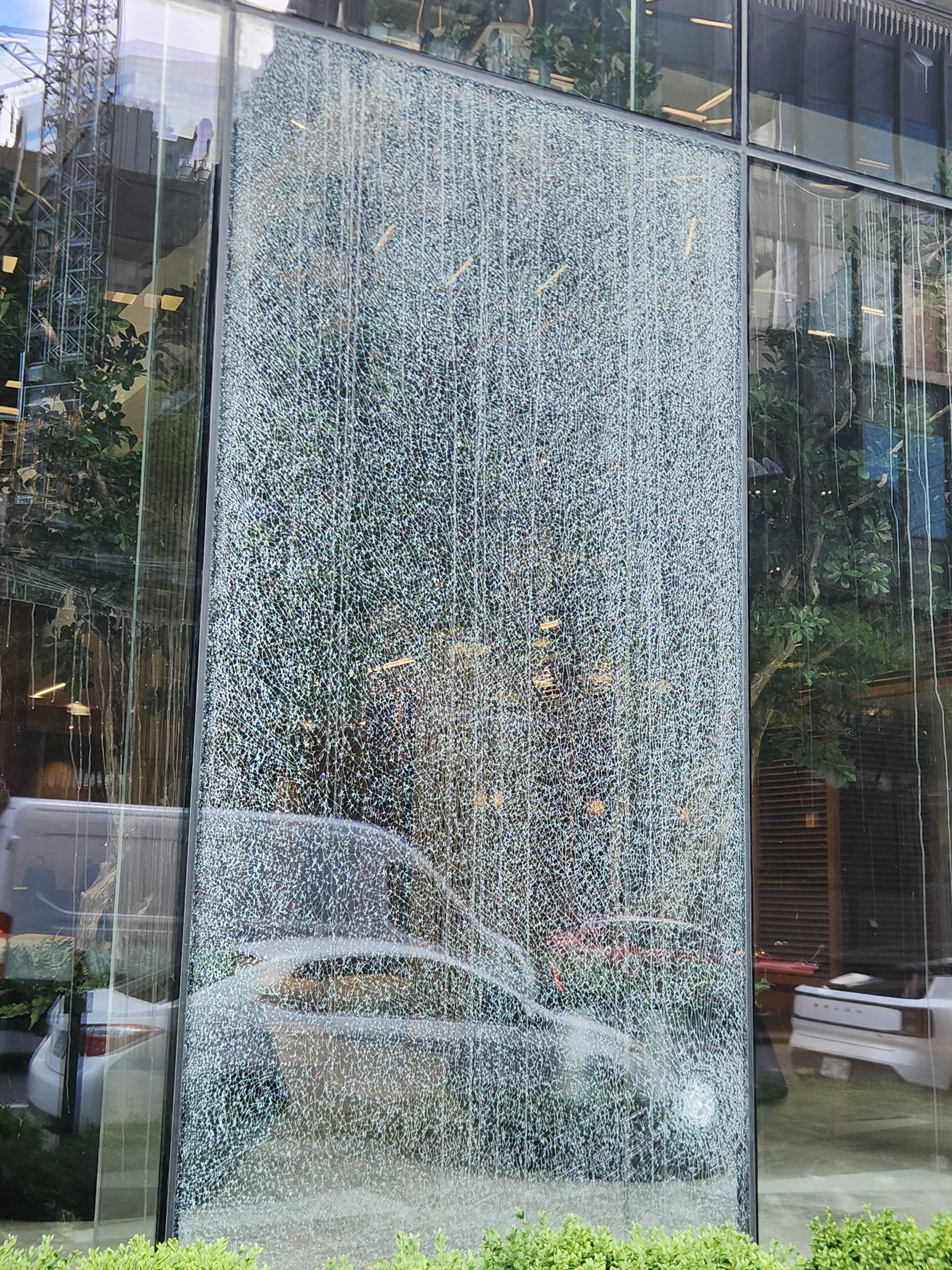 Une vitre du projet a été fracassée sur la rue Saint-Jacques. Il semble y avoir eu un coup bien localisé.