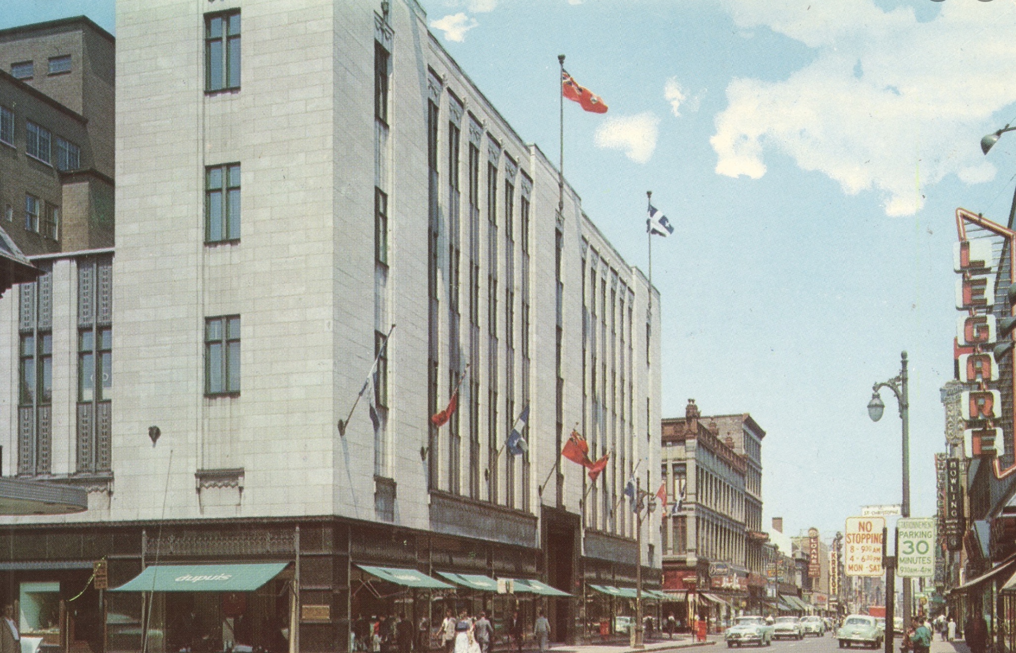 À noter qu’à cette époque avant l’omniprésence de l’automobile, les grands terrains de stationnements en ville n’ont pas encore fait leur apparition. Les rues sont encore étroites dans un Montréal où la modernité ne se pointera qu’à la fin des années 50.