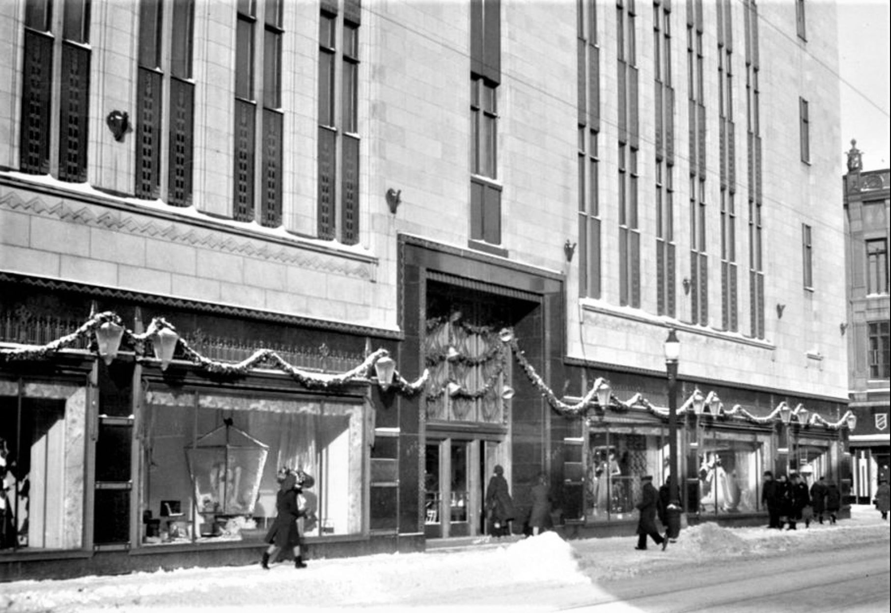 Le majestueux Magasin Dupuis Frères, avec son style Art déco emblématique, représentait un véritable joyau architectural. Cette photo de 1939 témoigne de sa grandeur avant sa démolition en 1976, sacrifiée pour laisser place à l’affreuse Place Dupuis. L’entrée du Village aurait sans doute un tout autre impact si ce bâtiment avait été conservé…
