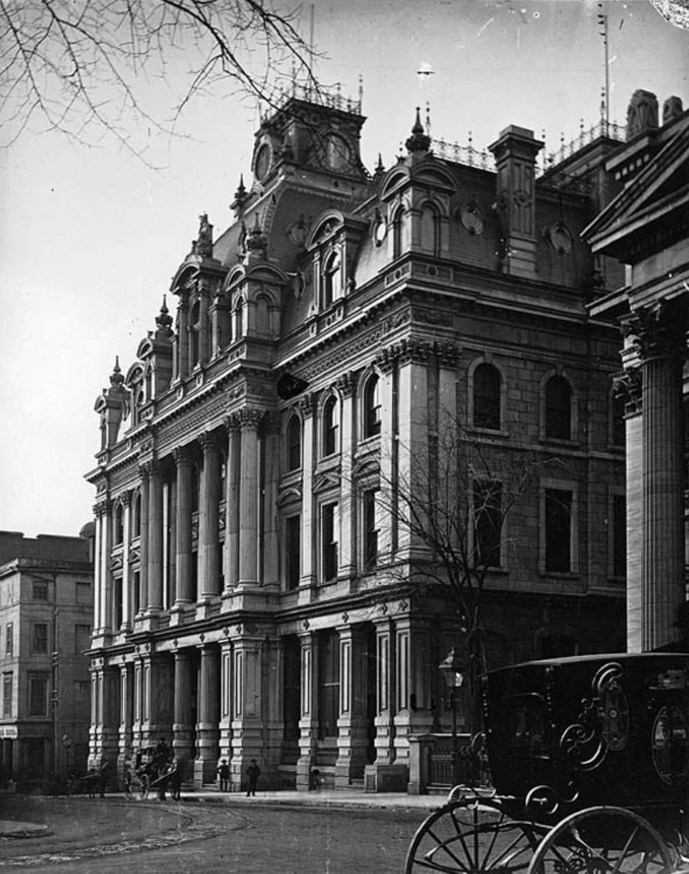 Le magnifique Bureau de Poste (1876-1959) , situé rue Saint-Jacques, démoli pour agrandir la Banque de Montréal (BMO). Ce bâtiment, avec son architecture impressionnante de style Second Empire , aurait ajouté une valeur inestimable à la Place d’Armes si on l’avait conservé. Une perte bien triste, mais qu’on ne doit pas oublier!