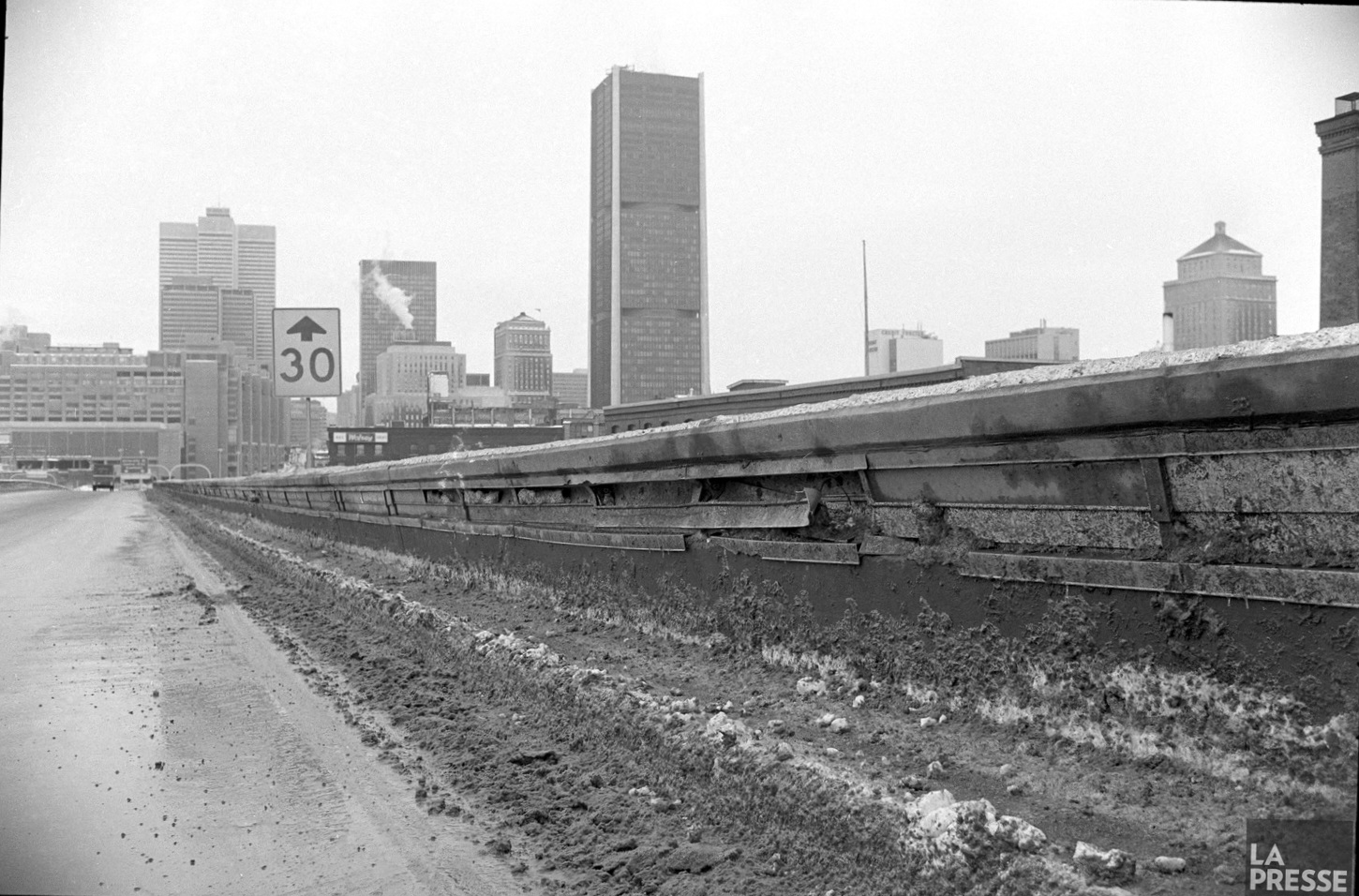 On constate pourquoi les lumières néons originelles incrustées dans les murets de l’autoroute Bonaventure n’ont pas survécu. Ici en 1969.