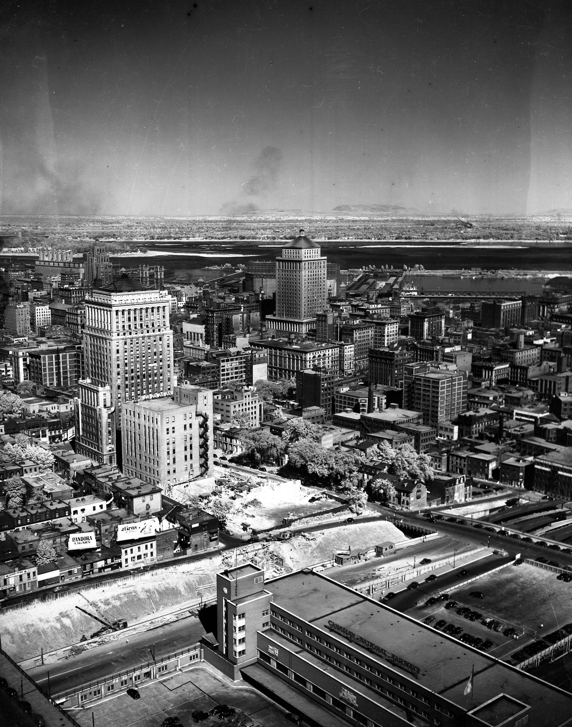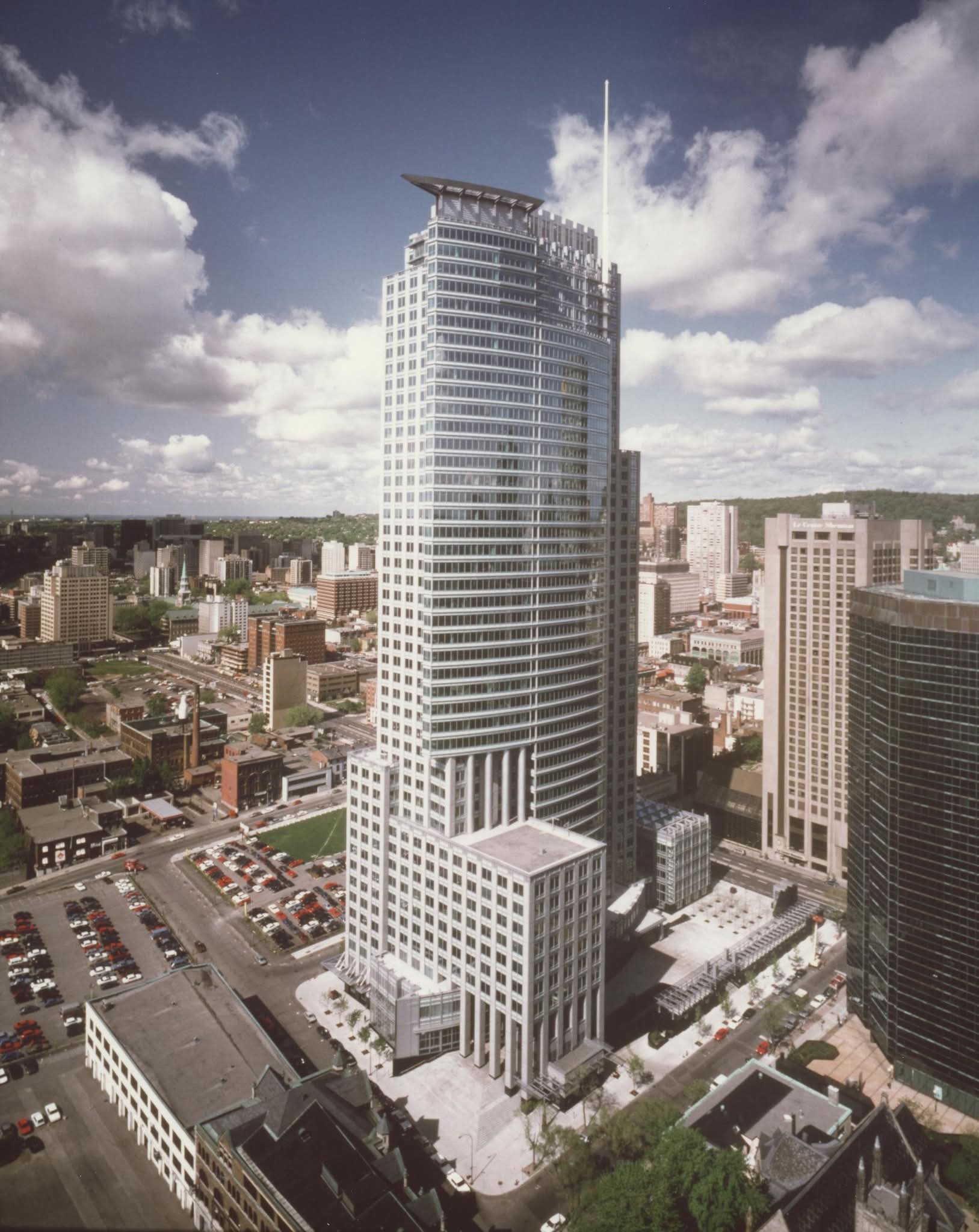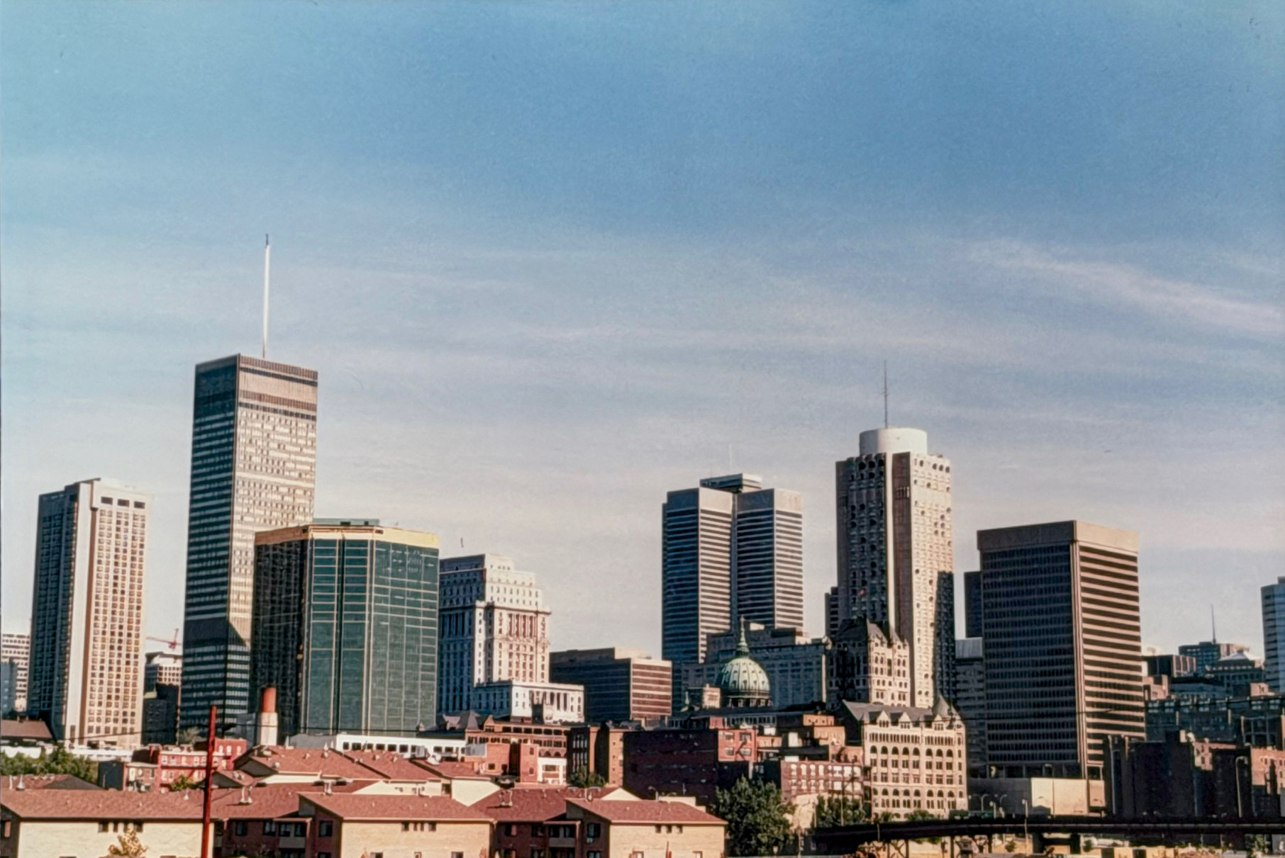 Merci pour cette fascinante photo personnelle. 1985, le début du grand boom immobilier à Montréal qui allait durer jusqu’en 1992. À l’avant-plan avec les toits rouges en pente, on remarque les condoplex résidentiels de basse densité construits le long de la rue Saint-Jacques entre la Petite Bourgogne et le centre-ville, et qui ont repeuplé ce secteur sous l’impulsion de la dernière admnistration Drapeau (1982-1986).