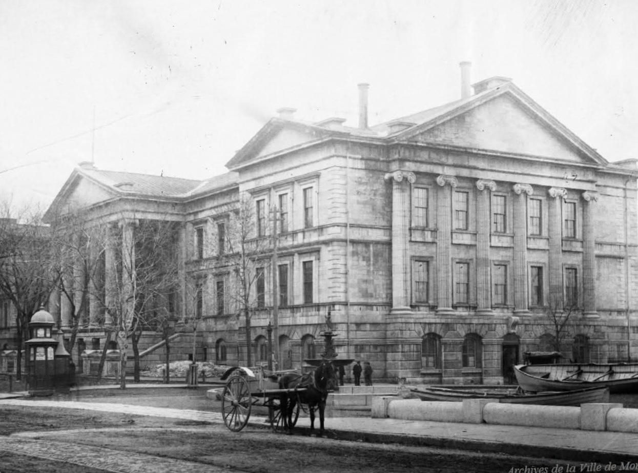 L’ancien palais de justice, maintenant l’édifice Lucien-Saulnier, à côté de l’hôtel de ville, ici photographié dans sa version de 1856, avant l’ajout d’un étage et du dôme vers 1890.