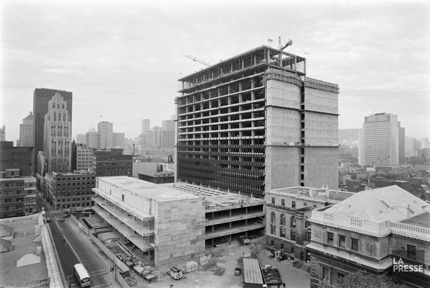 J’étais sur le viaduc de la rue Guy, juste au nord de Notre-Dame, avant sa démolition. Dans le bas de la photo, à droite, on voit le viaduc de la rue de la Montagne. Je photographiais l’édifice Lavalin en train d’être terminé, ne sachant pas que quelques années plus tard, j’y aurai mon premier emploi après mes études.