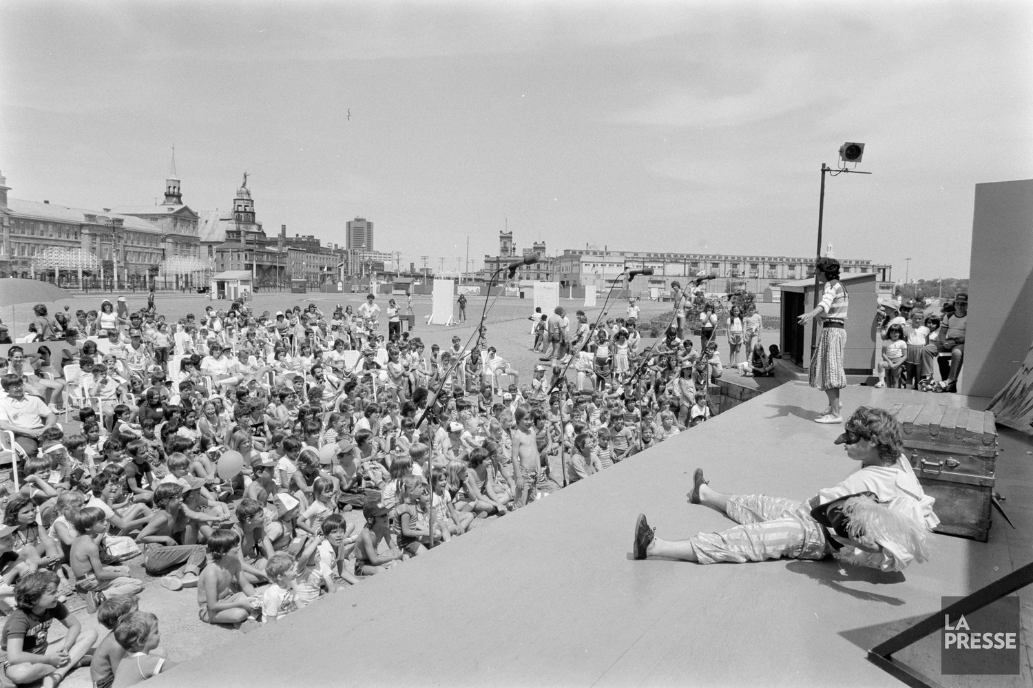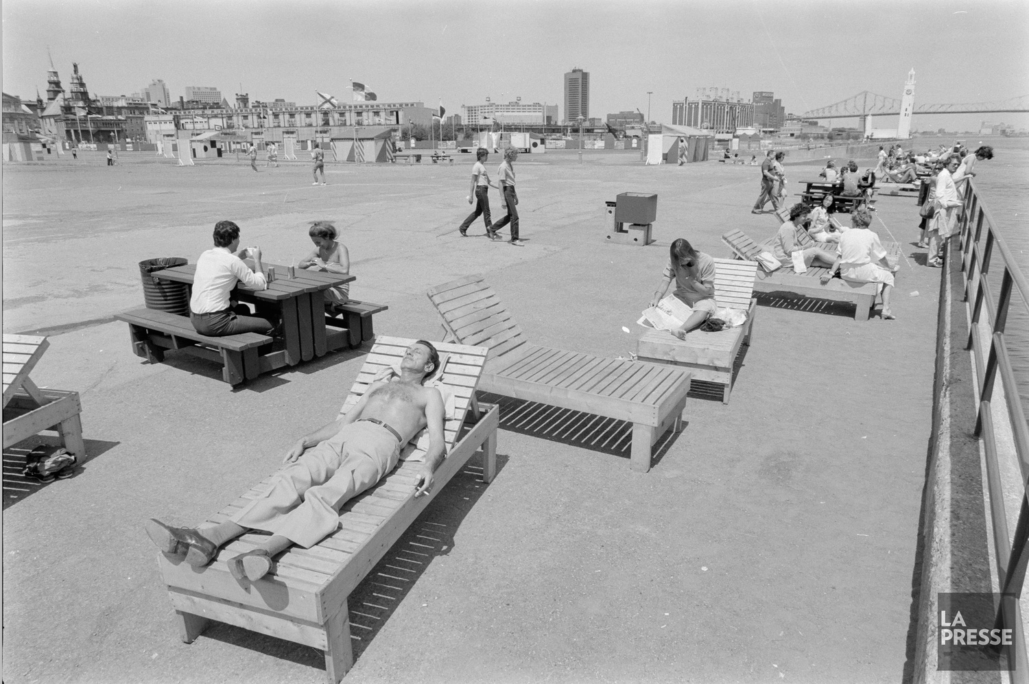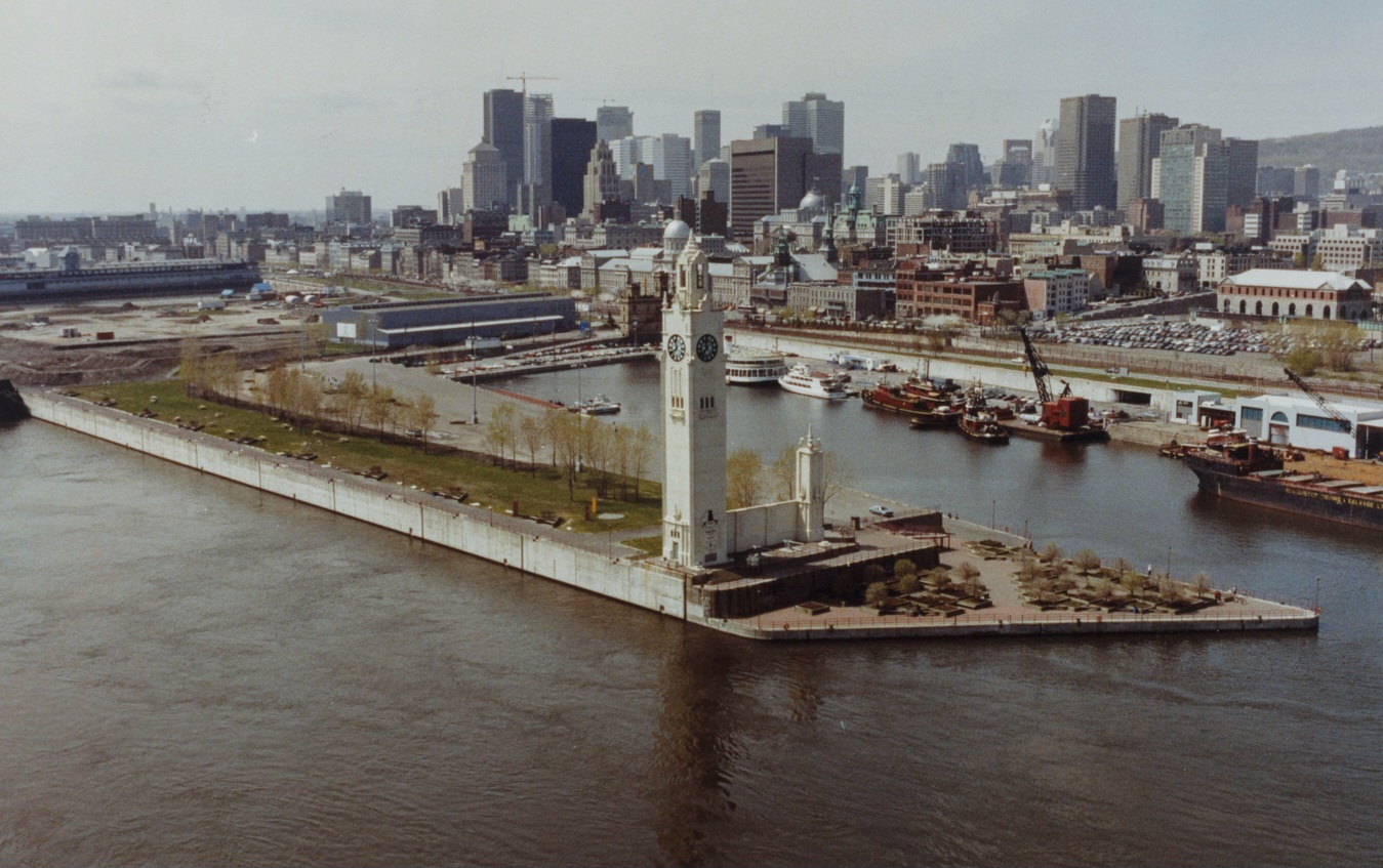 Le quai de l’Horloge le 9 mai 1991, avec l’aménagement du bassin Bonsecours en arrière-plan en prévision du 350e de Montréal et la construction du 1000 et du IBM-Marathon.