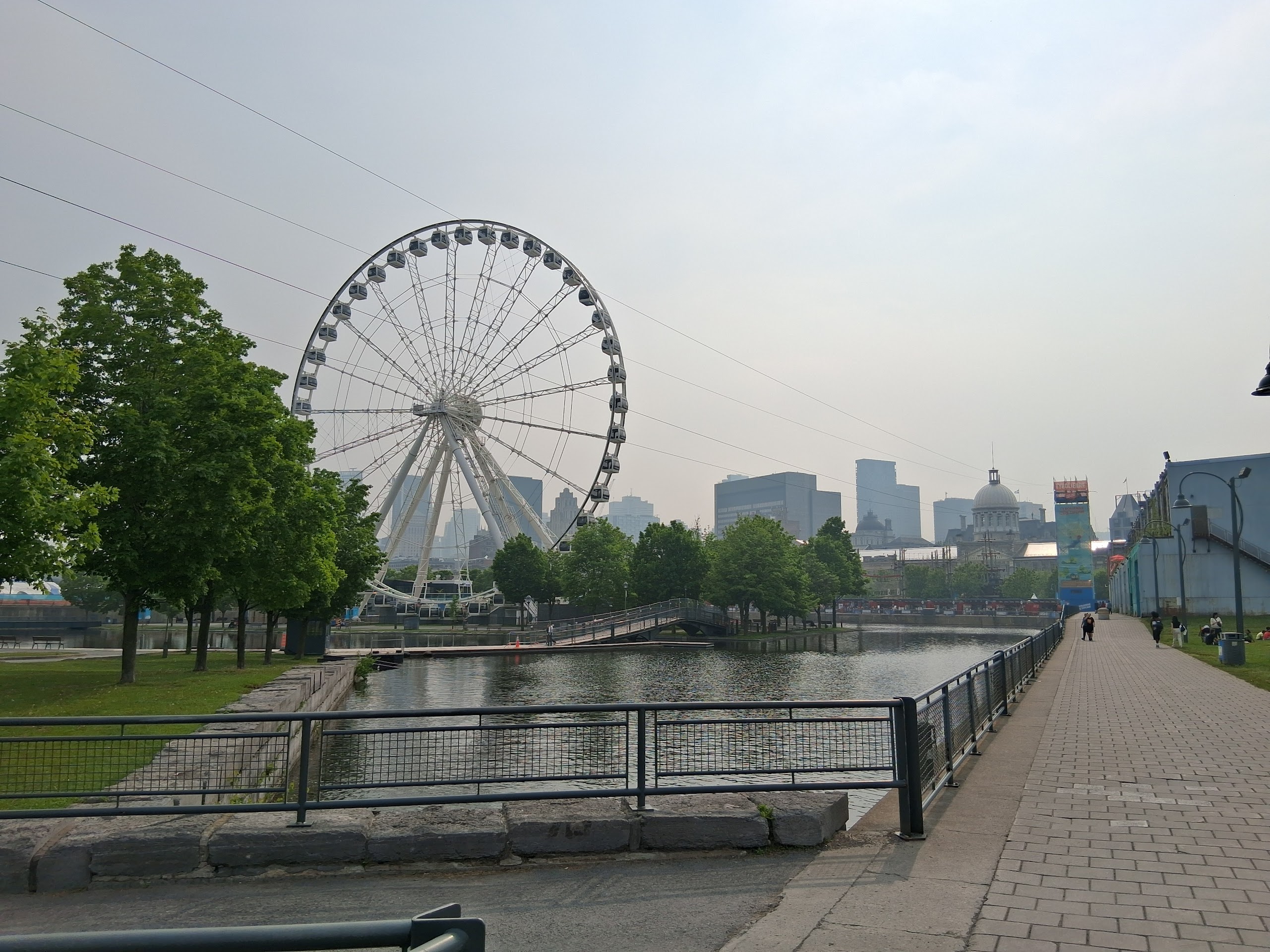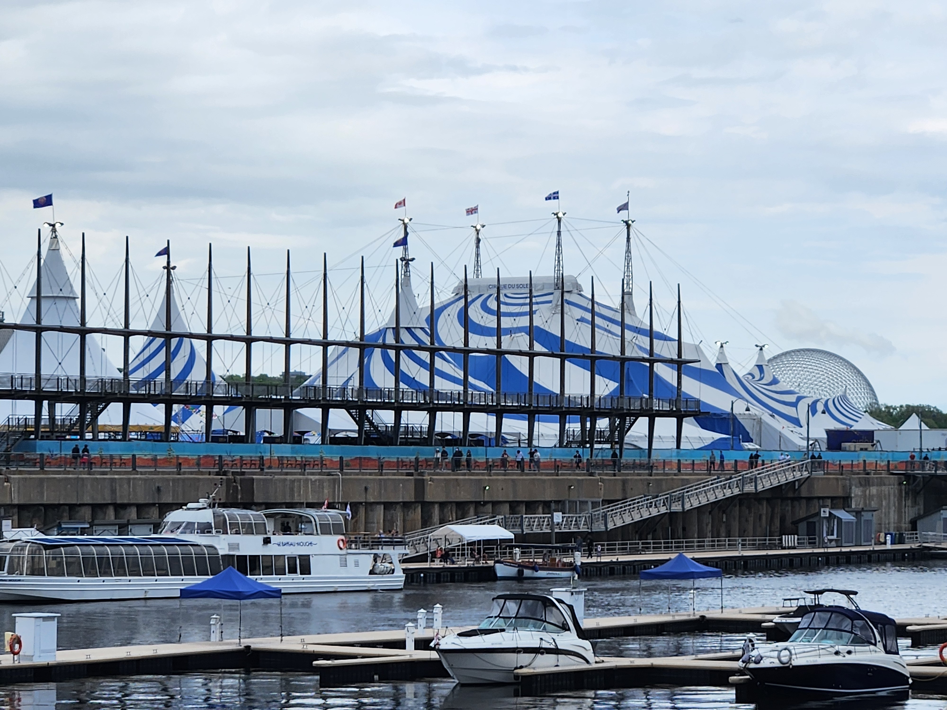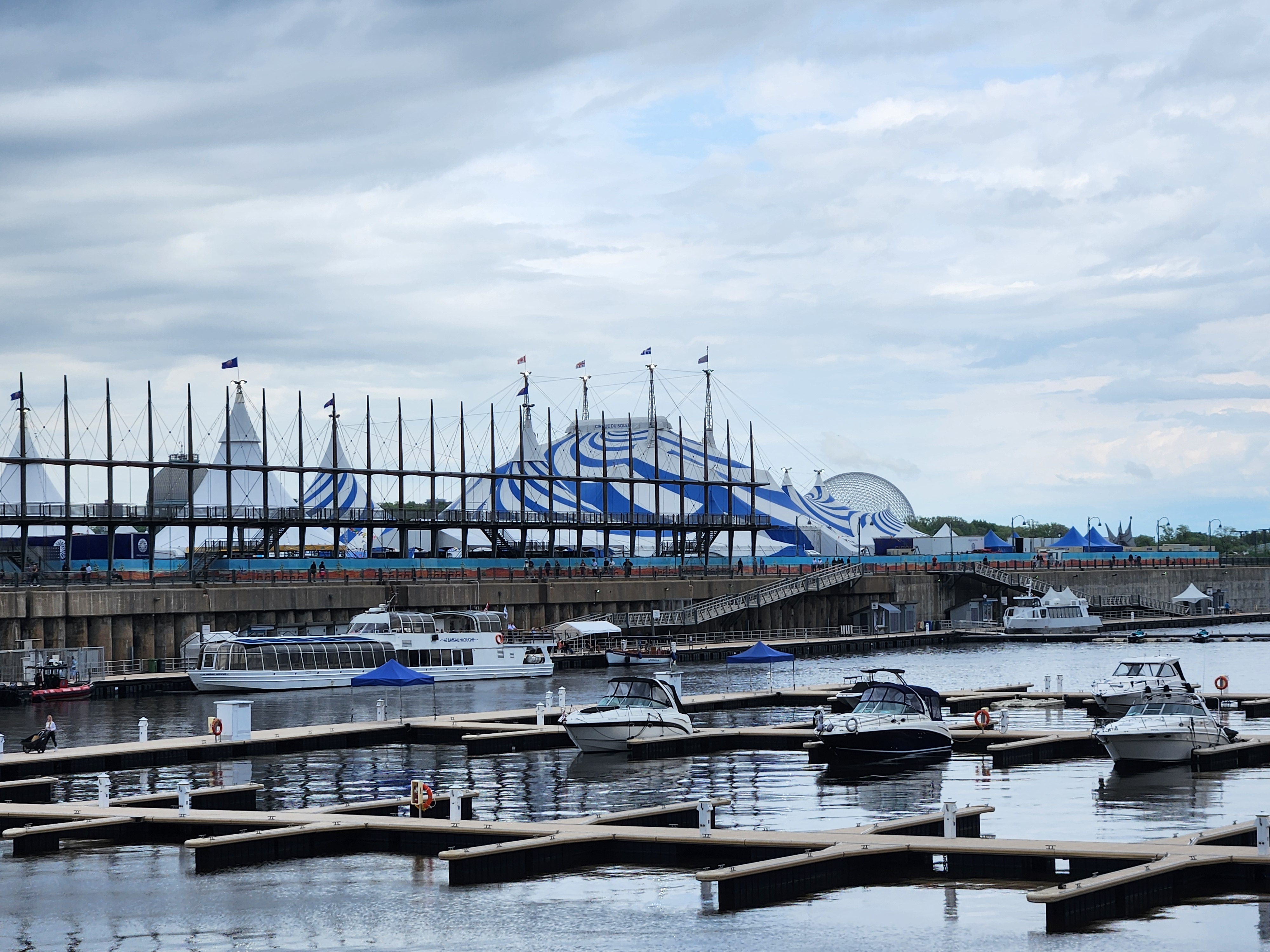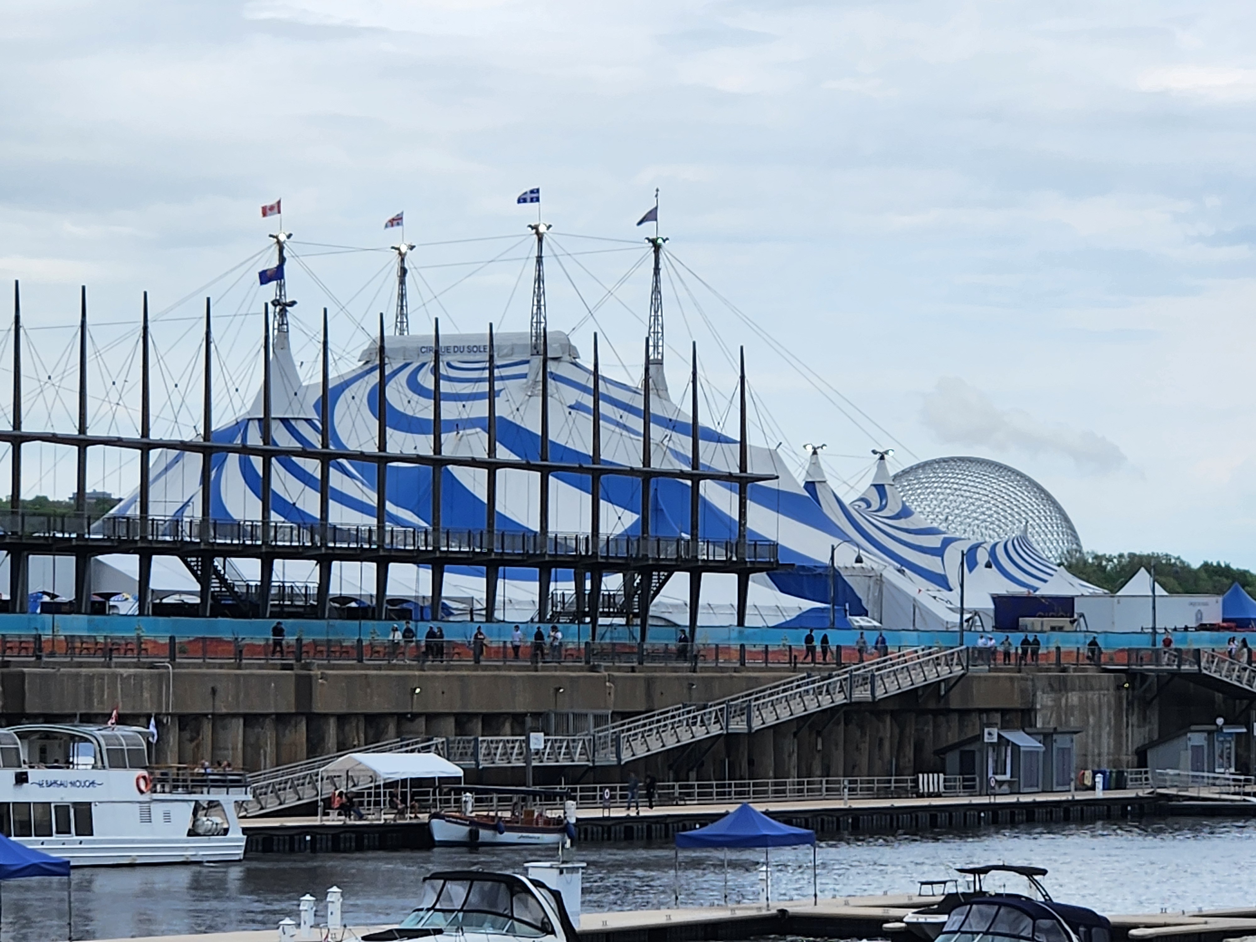Le Cirque de plus proche s’agence bien avec la Biosphère en arrière plan. On remarque la couleur d’origine des clôtures du Vieux-Port, qui étaient mauves dans les années 80-90.