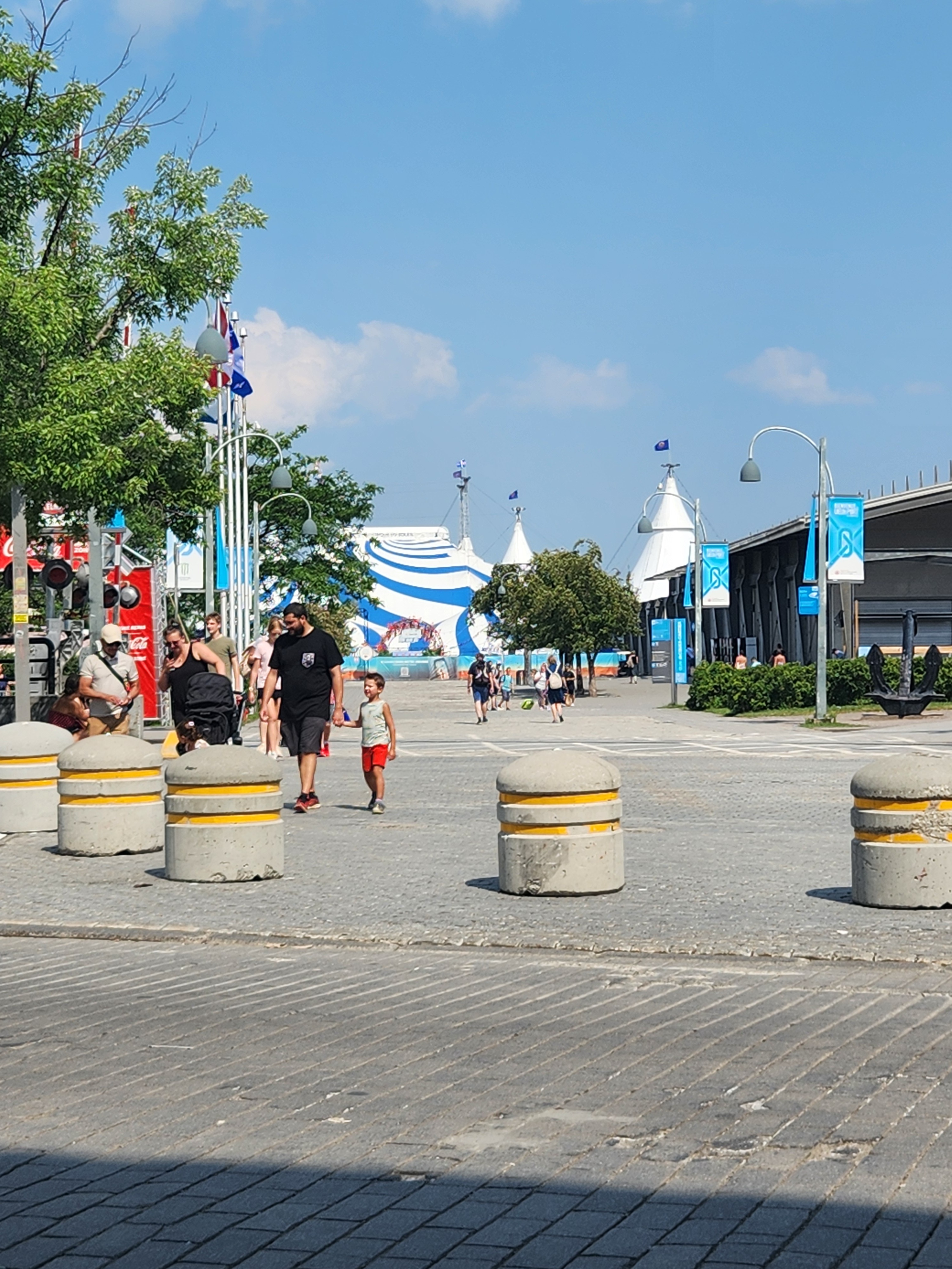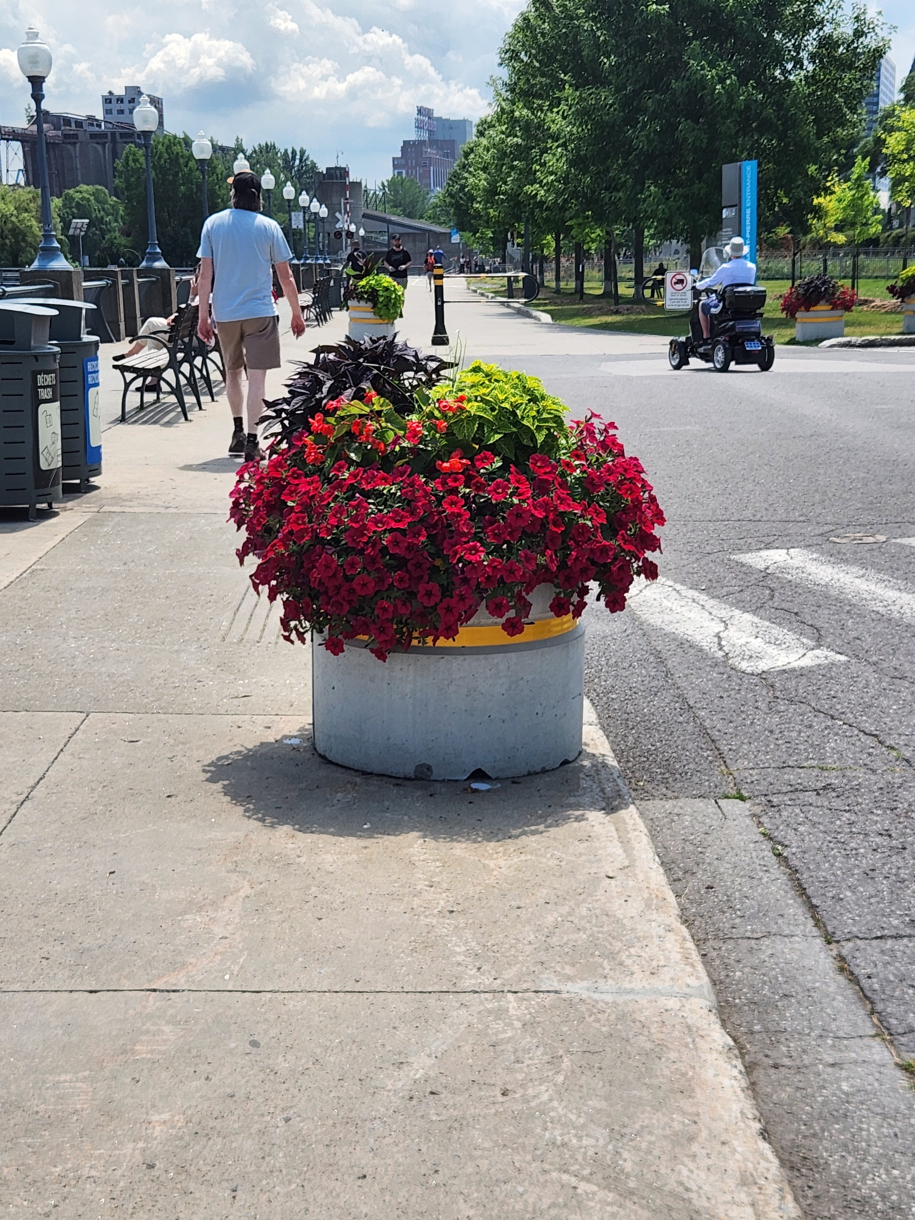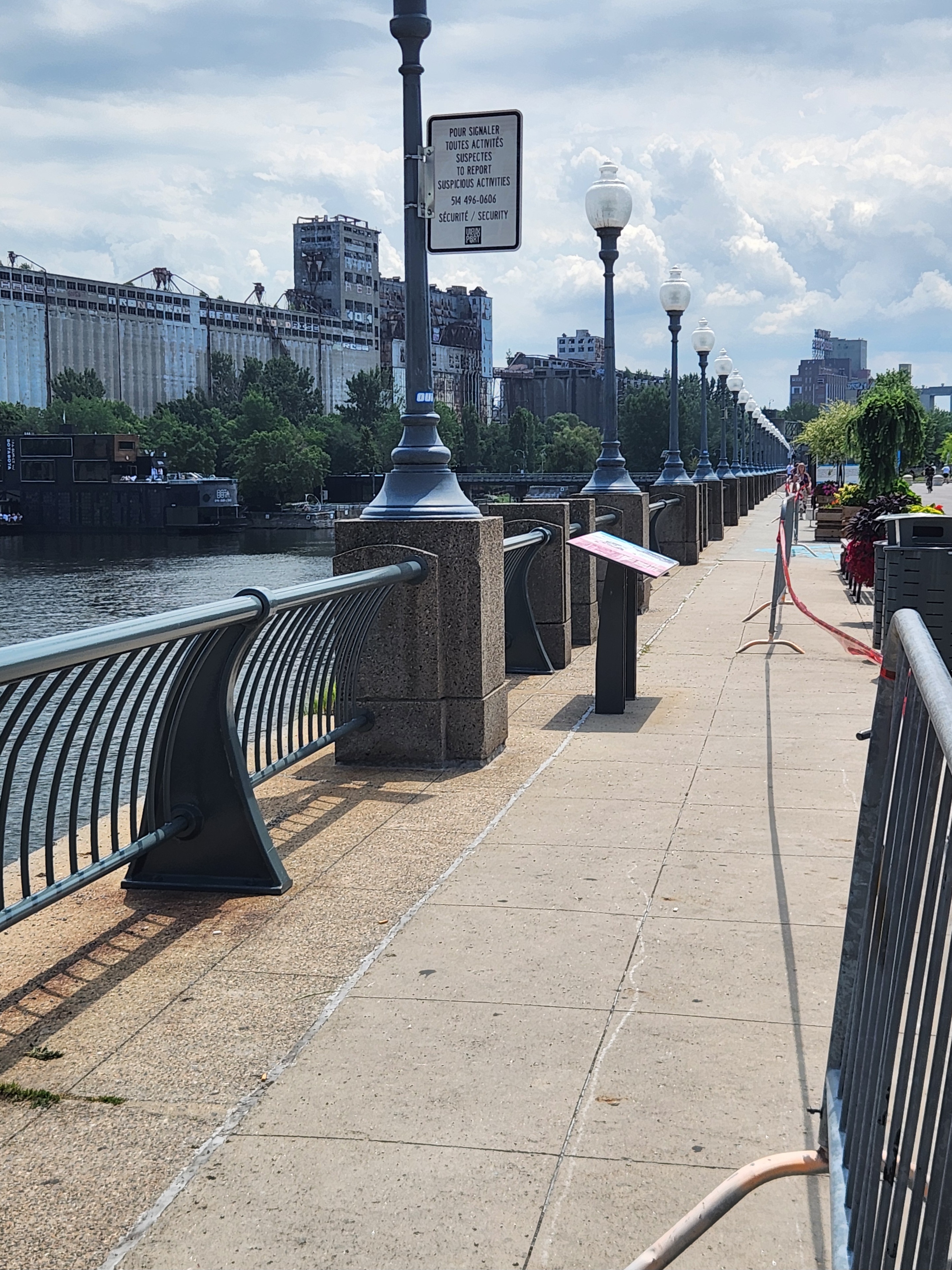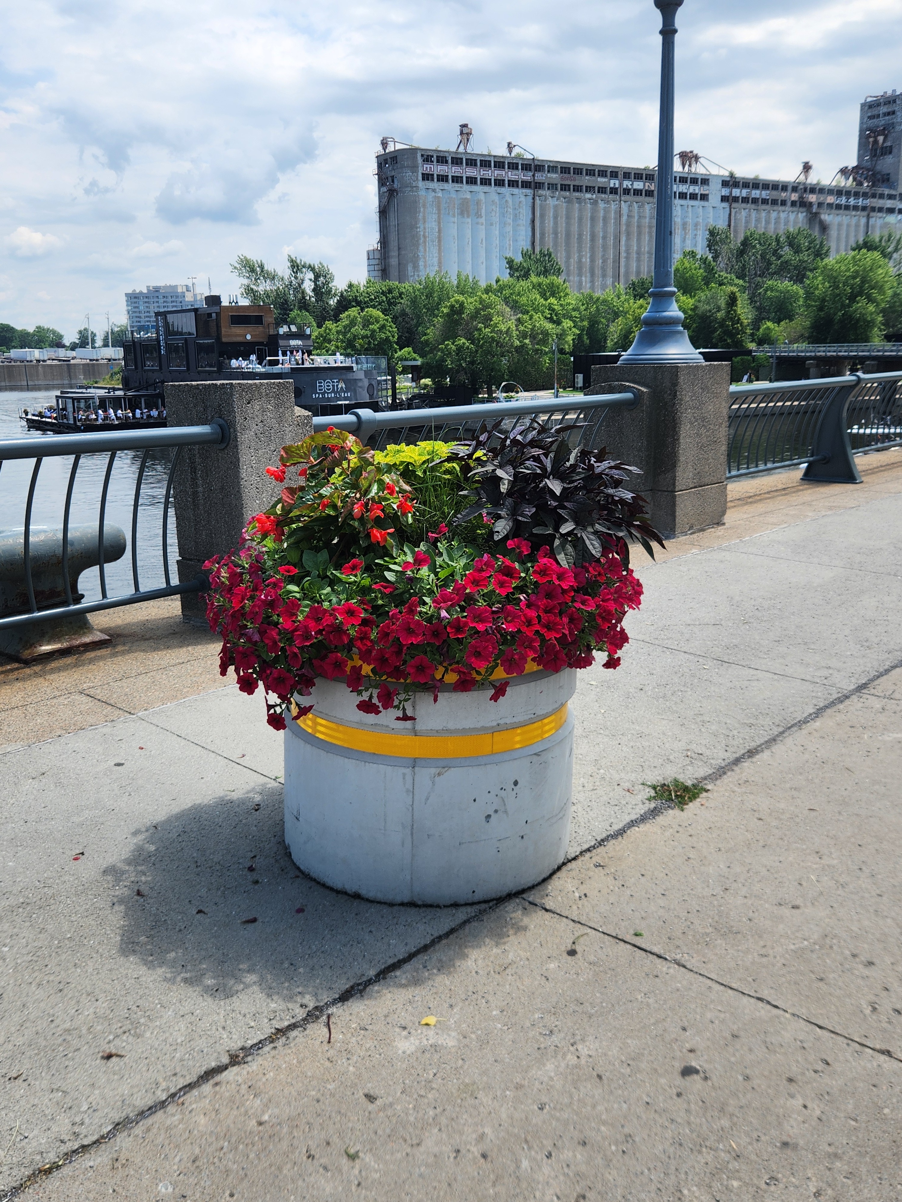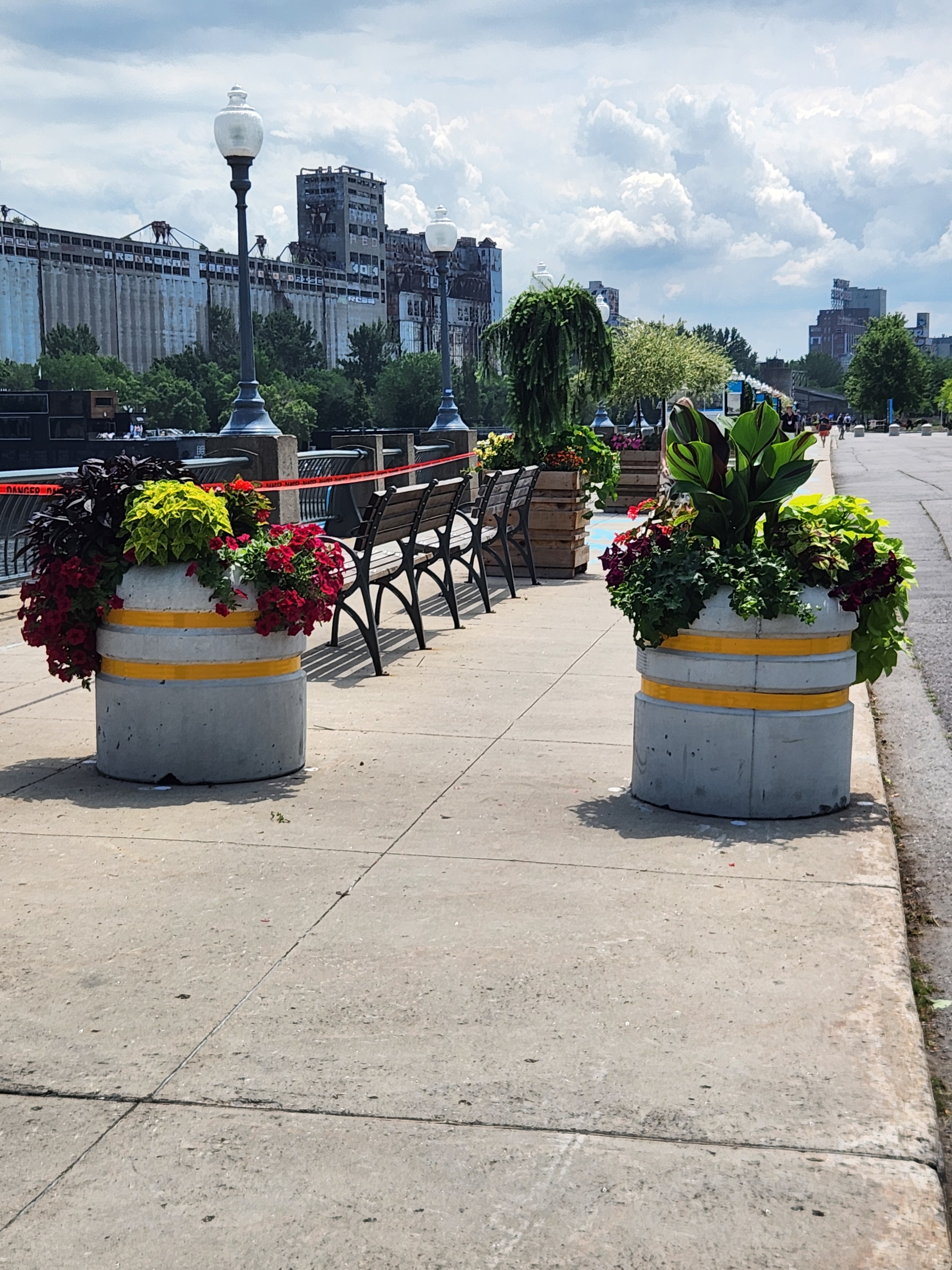 On achève la peinture des rambardes le long du boardwalk. Beaucoup de bollards anti-béliers remplis de fleurs, magnifiques. Ça fait changement des blocs de béton disséminés dans le Vieux-Montréal.