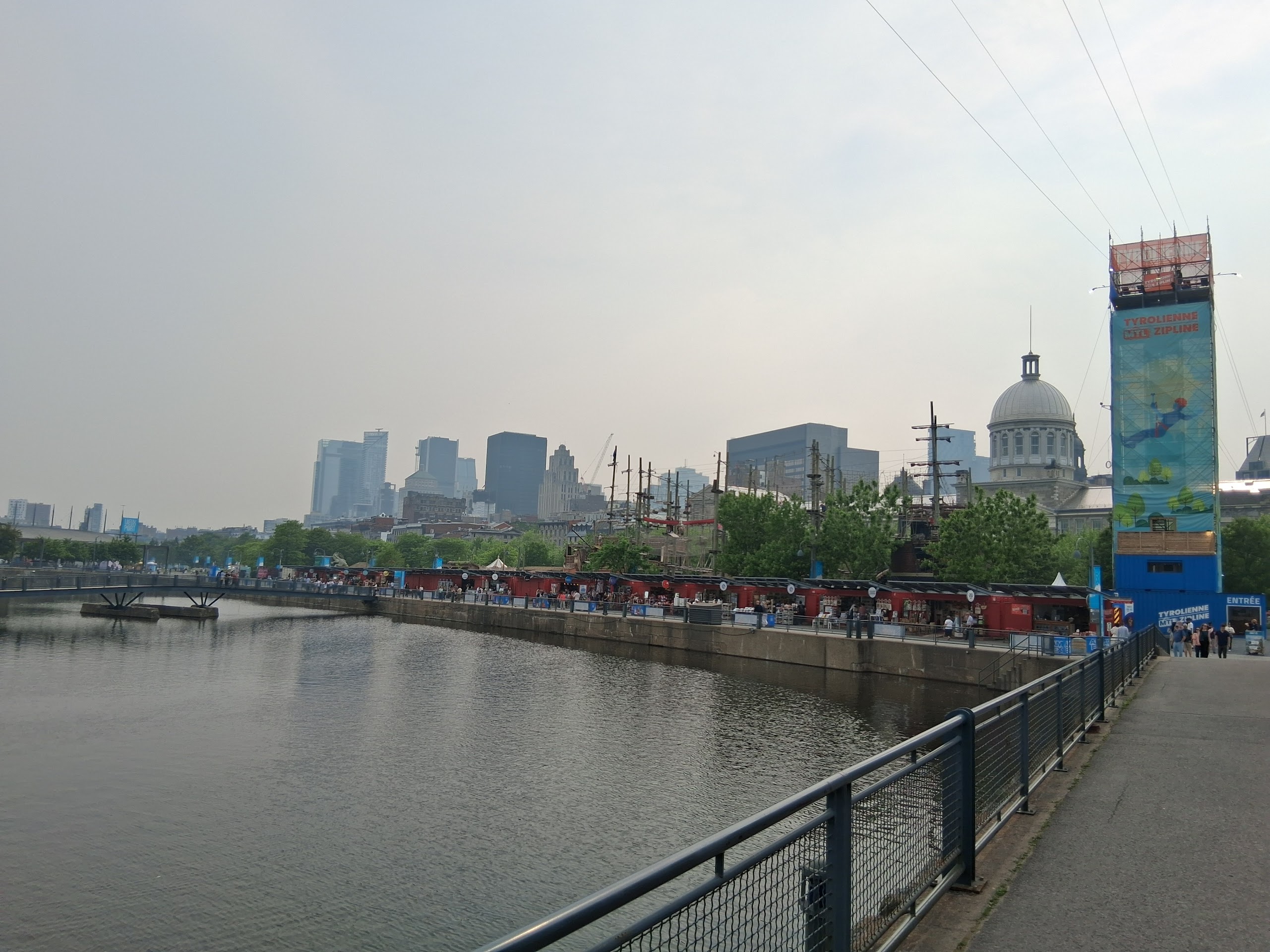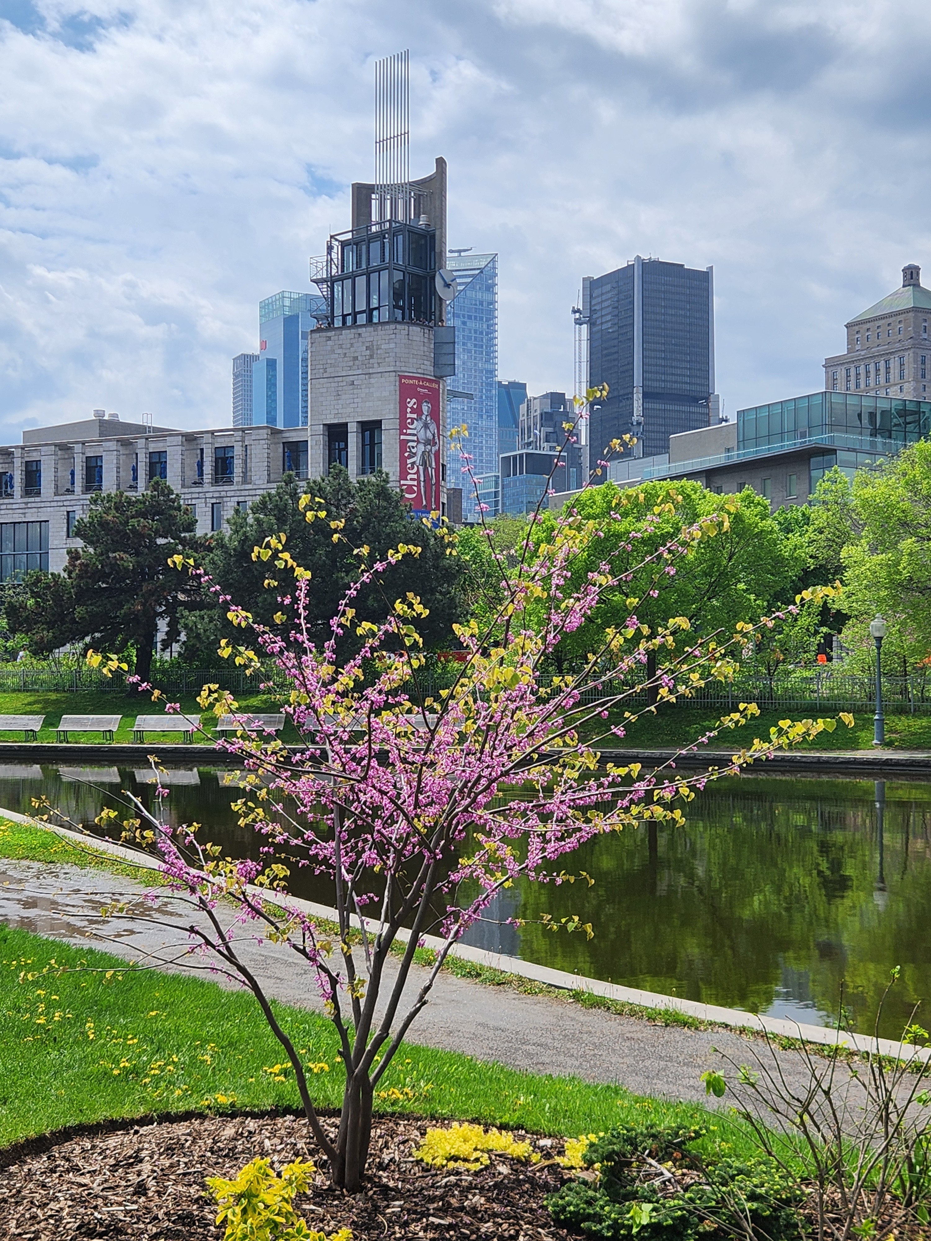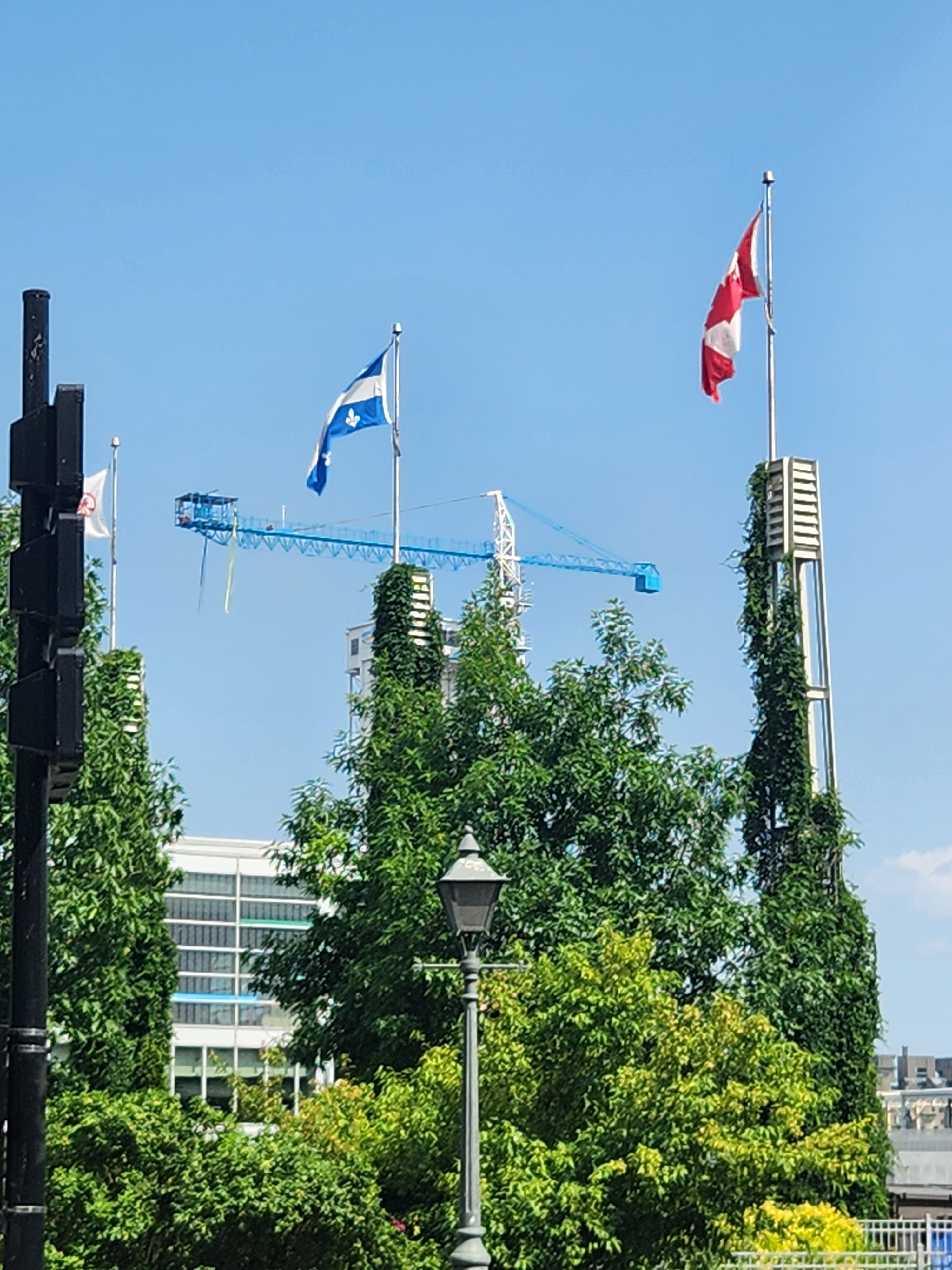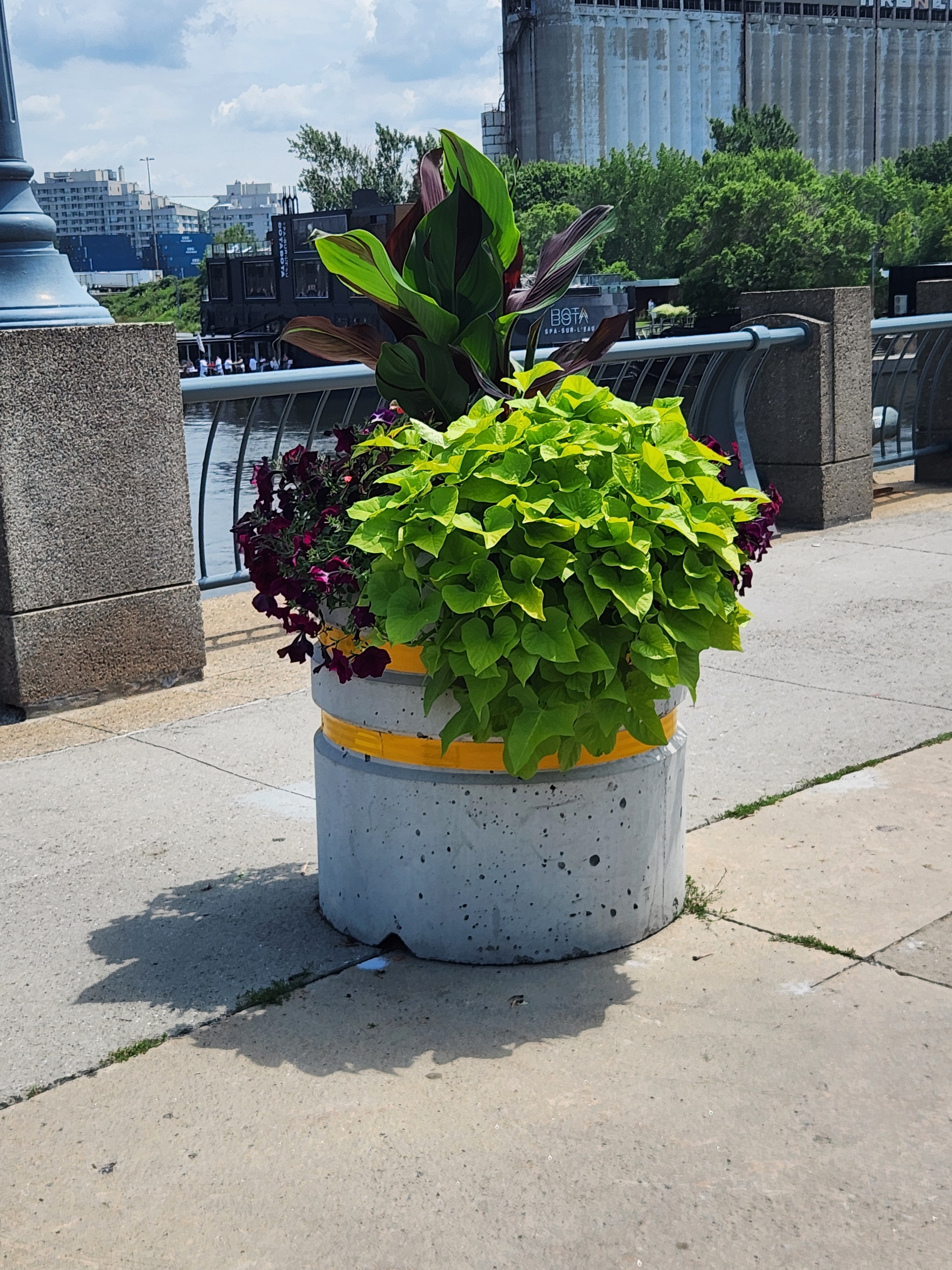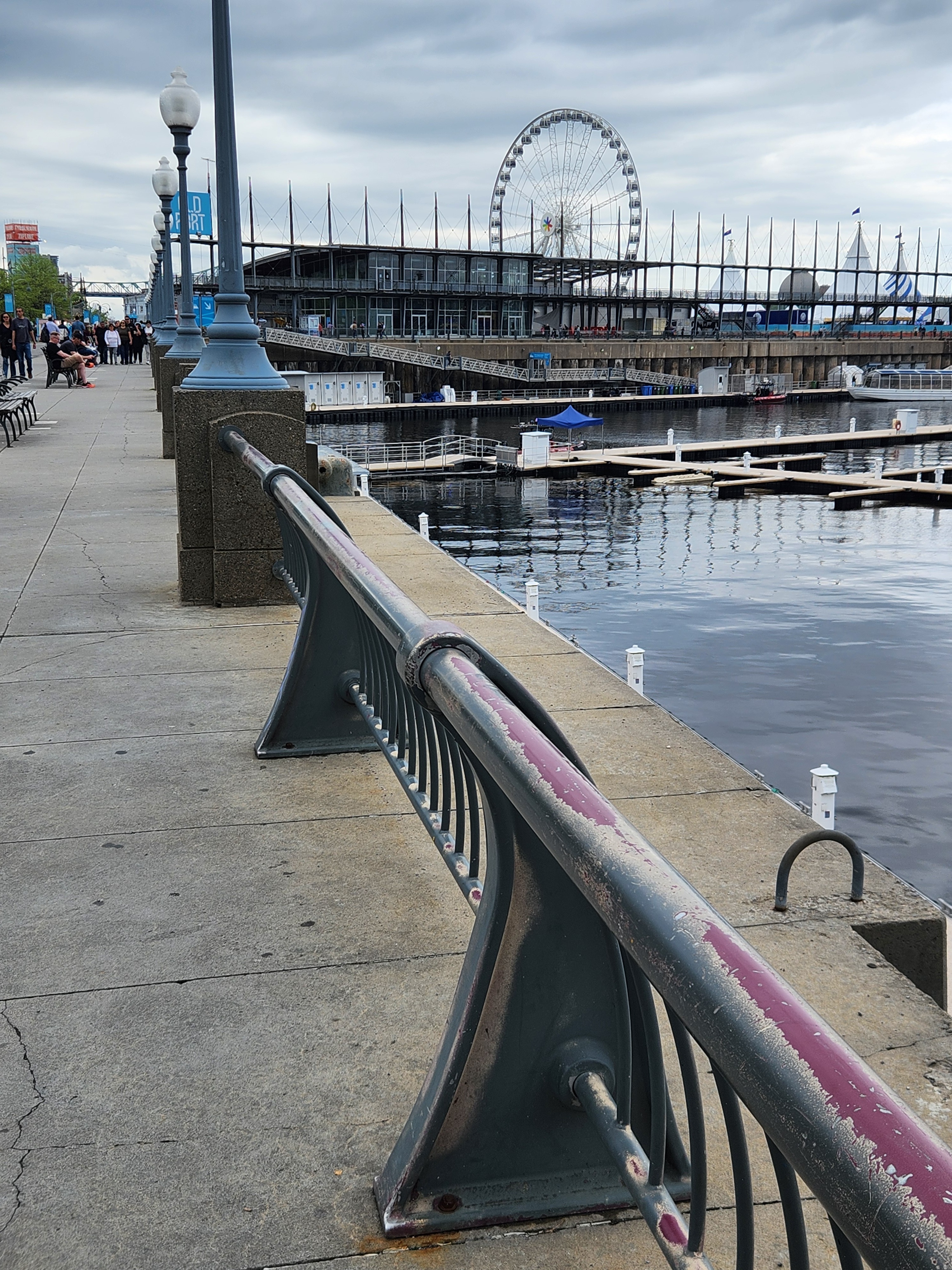 On achève la peinture des rambardes le long du boardwalk. Beaucoup de bollards anti-béliers remplis de fleurs, magnifiques. Ça fait changement des blocs de béton disséminés dans le Vieux-Montréal.