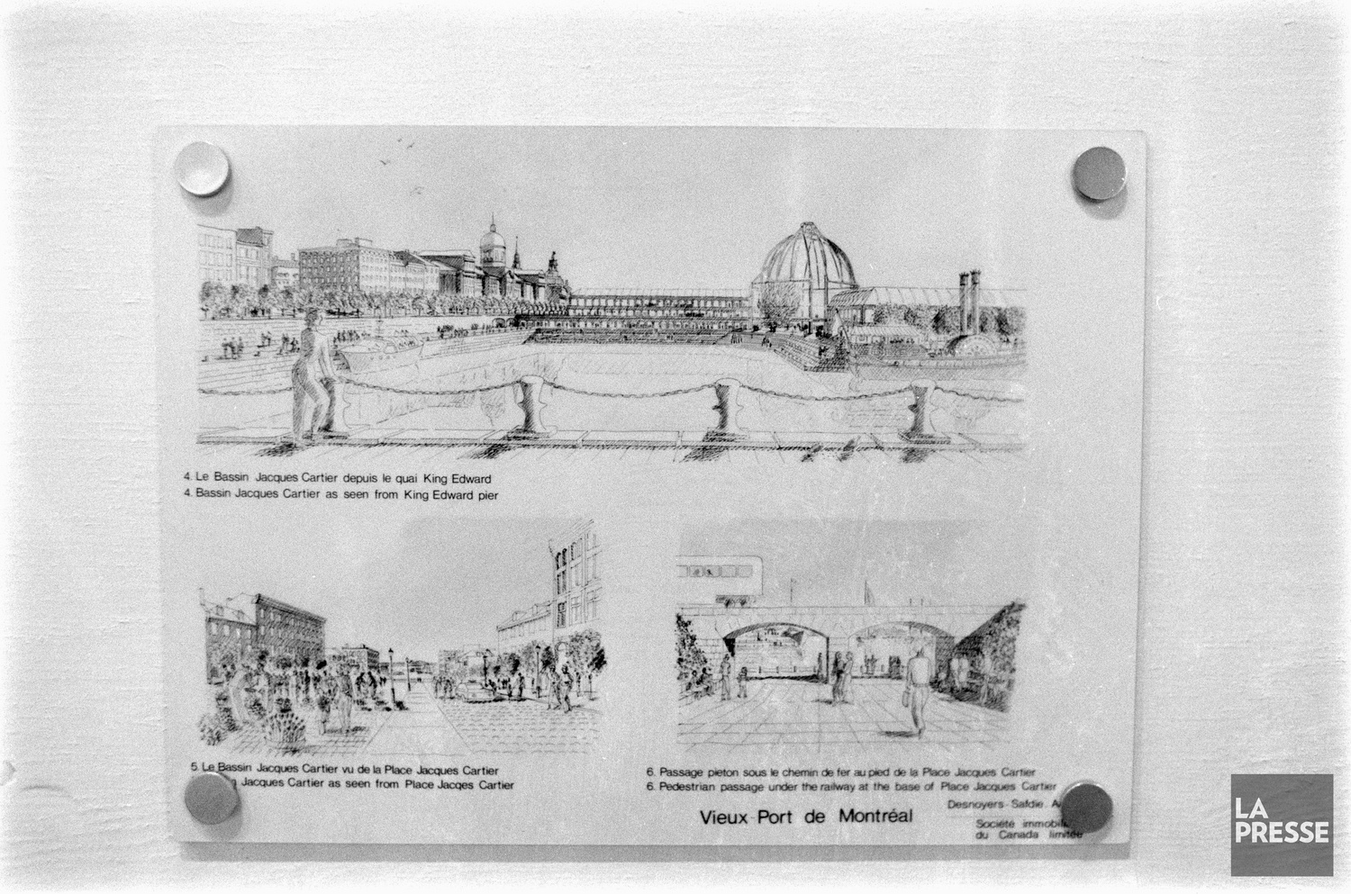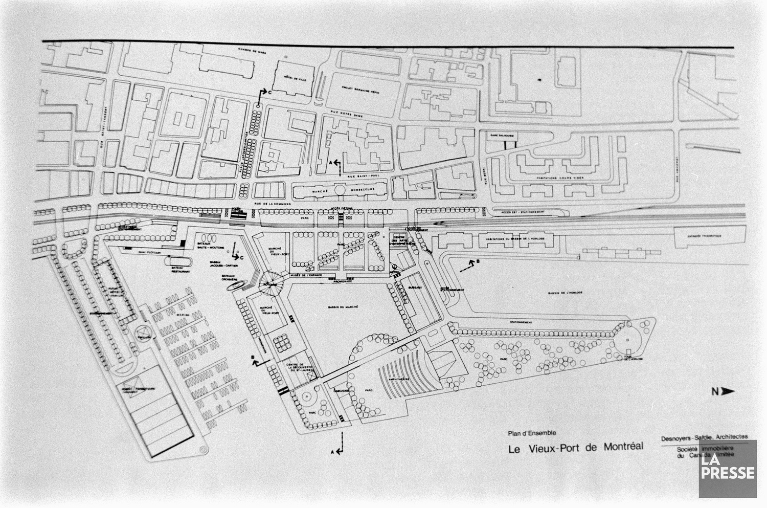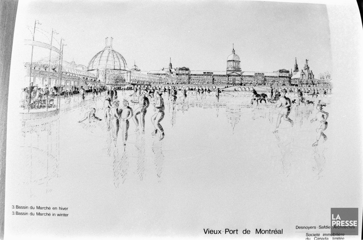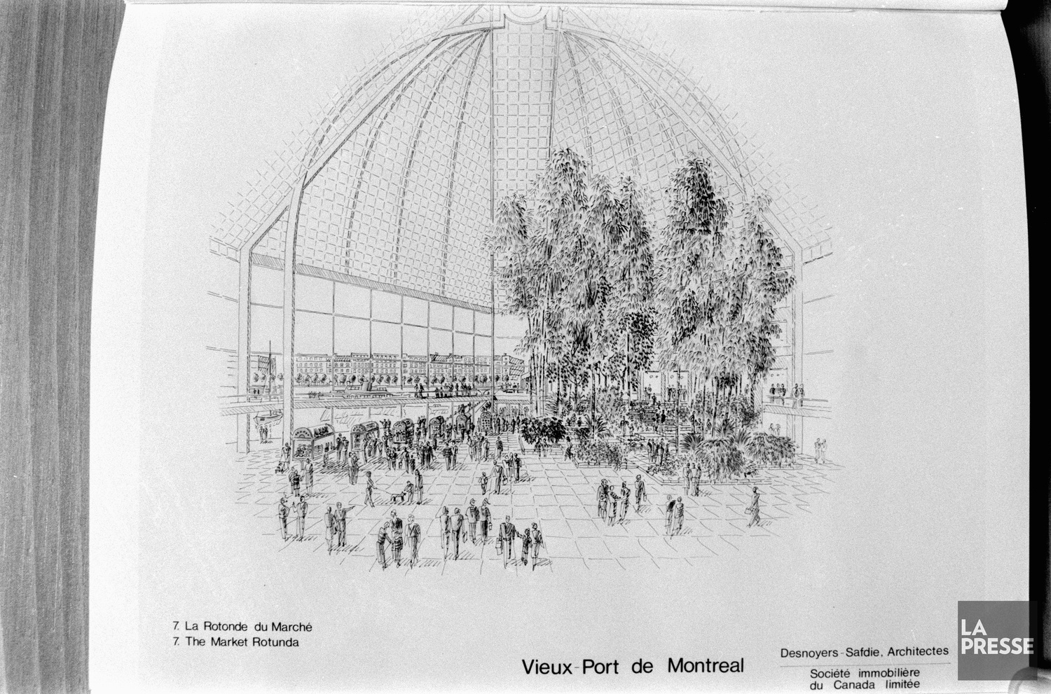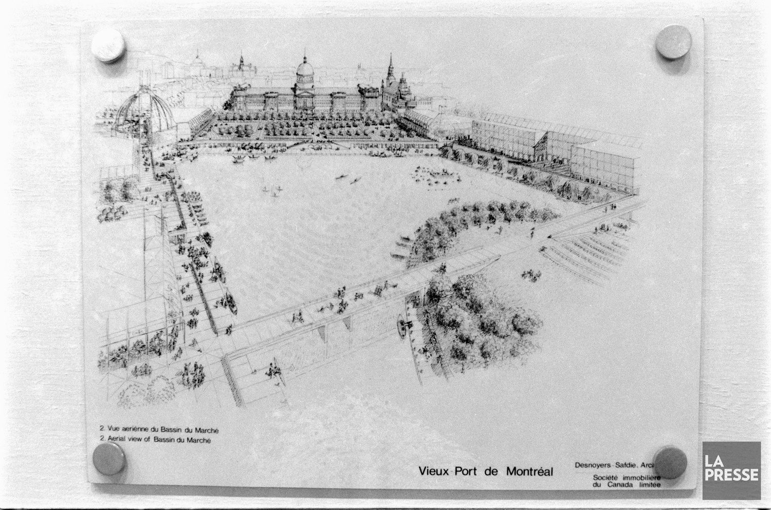 Première version (non-réalisée) de l’aménagement du Vieux-Port de Montréal, présenté en 1985. Desnoyers, Safdie Architectes pour la Société Immobilière du Canada Limitée, qui est d’ailleurs toujours propriétaire des terrains du Vieux-Port, 40 ans plus tard. Cette version du Bassin donnait une prépondérance à la vue vers le Marché Bonsecours et présentait un marché public surmonté d’un dôme de verre.