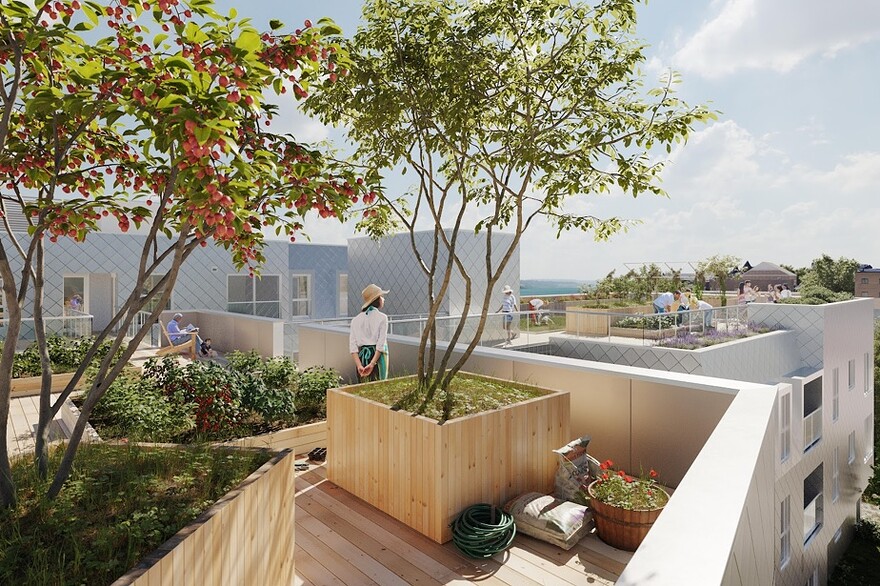 Les espaces communs, représentant au total 5000 pi2, ont déjà été déterminés : on trouvera ainsi une cuisine collective, une buanderie, une salle de jeux, un atelier, une chambre d’invités, une grande salle polyvalente pour les repas ou d’autres activités, un espace de quiétude pour le travail ou la lecture, ainsi qu’une zone dont la vocation sera fixée par les futurs cohabitants. La moitié des toits pourra être aménagée en potagers et espaces verts.
