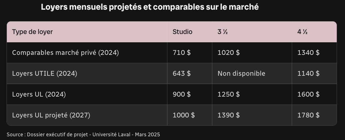 Les loyers sont aussi plus dispendieux que ceux offerts par UTILE, un organisme à but non lucratif ayant construit en 2023 un immeuble de 205 logements à deux pas du campus, sur le chemin Sainte-Foy. Ces appartements sont aussi meublés et comprennent certains services également offerts par l’Université Laval.