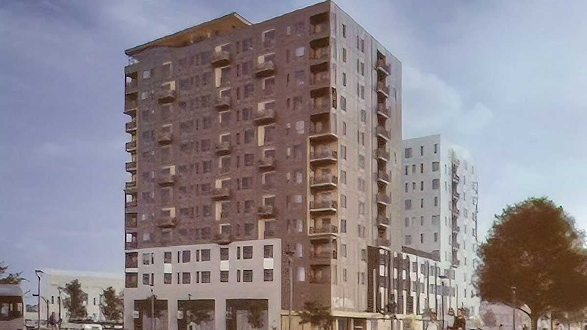 Le futur bâtiment du projet Totem et ses 367 unités, avec le bâtiment de l’ancienne résidence et ses 53 unités, à droite sur la photo. (Logis-Expert)