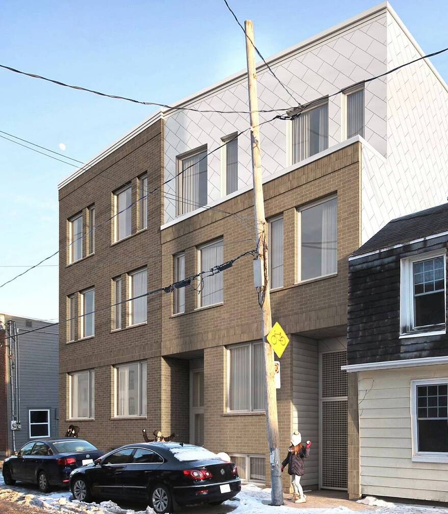 TNE Immobilier est derrière la construction du nouvel édifice, qui doit compter 8 maisons de ville (4 1/2 et 5 1/2). Quinzhee aurait là aussi signé les plans.