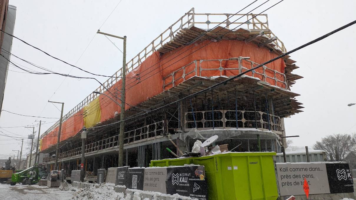 La construction de l’immeuble résidentiel et commercial Le Kali est toujours en cours, au coin du boulevard Charest et de la rue de l’Aqueduc.