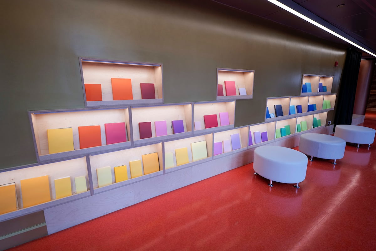 Au deuxième étage, on retrouve un coin lecture garni grâce à un partenariat avec les bibliothèques de Québec. Dans un corridor, une ancienne porte dorée de l’époque Ex Machina orne le mur.