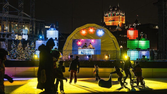 La Discoglace au Port de Québec, avec le Château Frontenac illuminé qui veille sur la scène à l’arrière-plan.