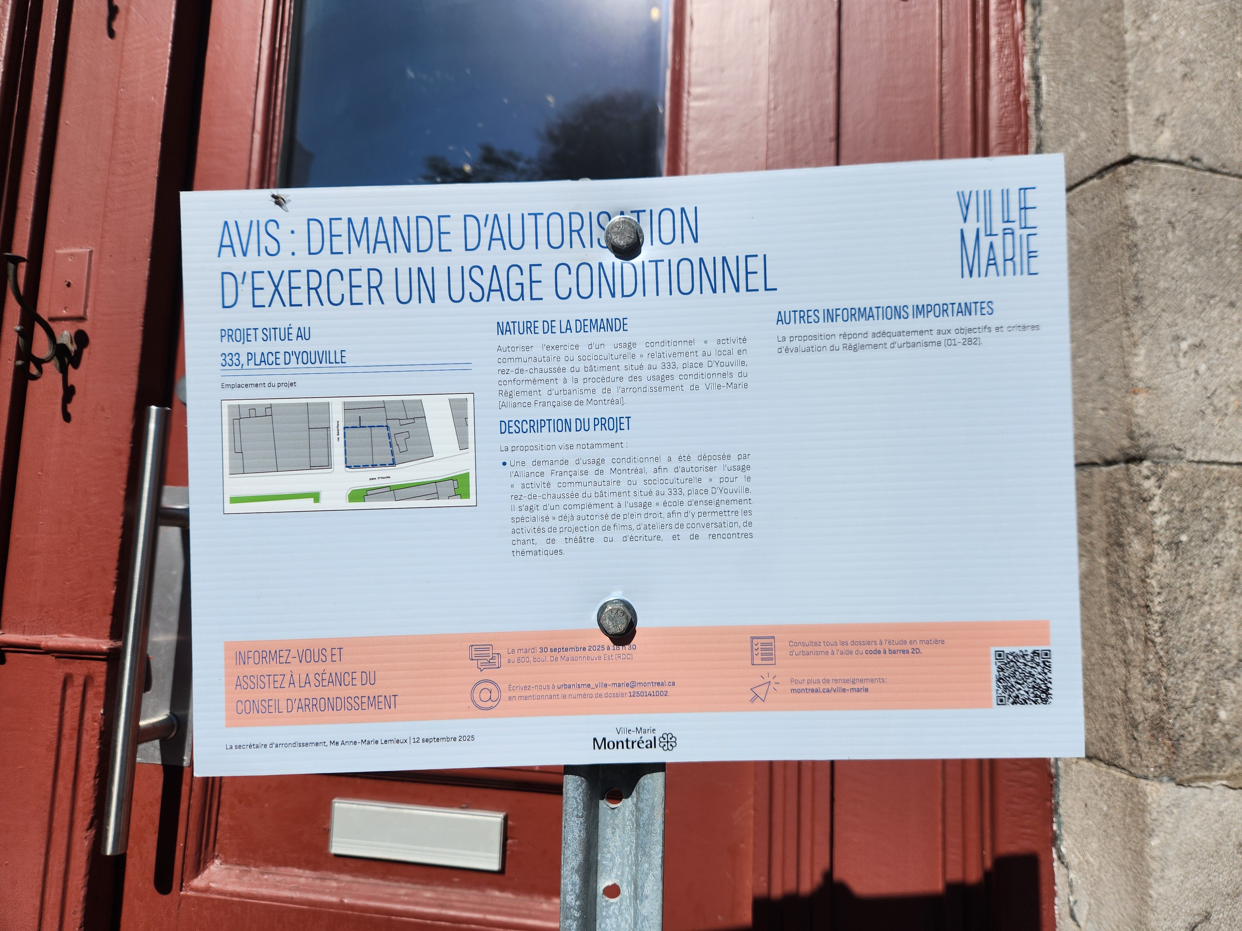 | 2025-10-03 | 3001882877 | 100 rue Prince | Face au boulevard Robert-Bourassa et face à la rue Ottawa, réaménager le perron du bâtiment afin de faciliter l’accès universel au bâtiment ainsi qu’ajouter un bac de plantation en béton. Tel que plans approuvés. |
