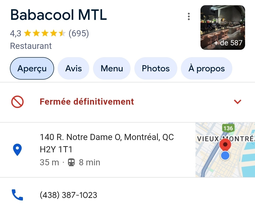 Fermeture définitive du restaurant Babacool dans le Vieux-Montréal.