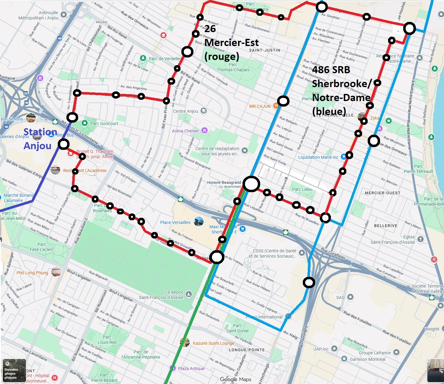 Ce que je trouve pratique d’un tel tracé, c’est que ça libère des quais de l’édicule Nord du métro Honoré-Beaugrand. Les 486 et 487 seraient fusionnés en une ligne express à haute fréquence, laissant de l’espace pour une deuxième ligne de SRB pour Repentigny.