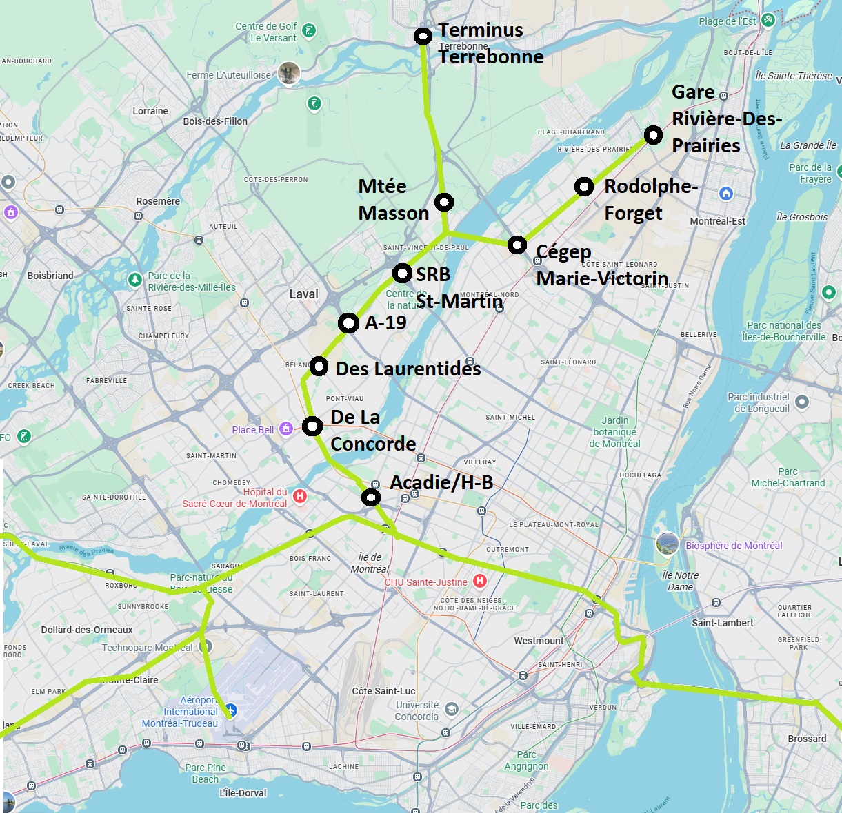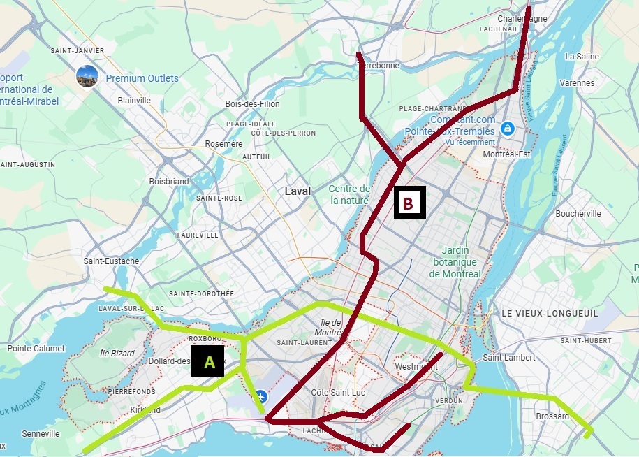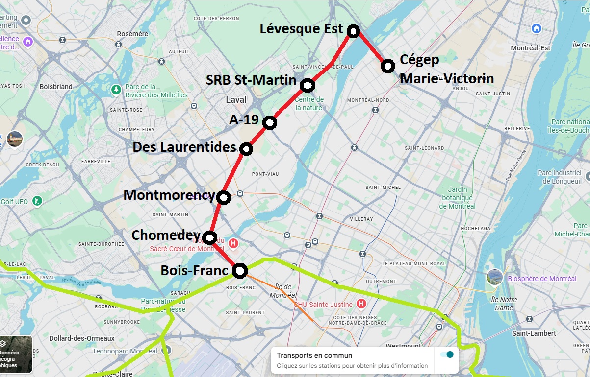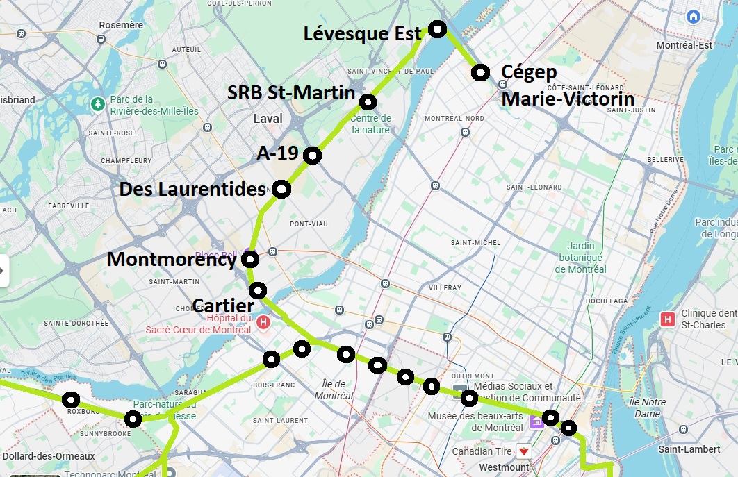 Donc, mon trajet idéalisé reprendrait principalement la branche Nord du plan de mars 2021 (Saint-Léonard/Mtl-Nord/RDP).