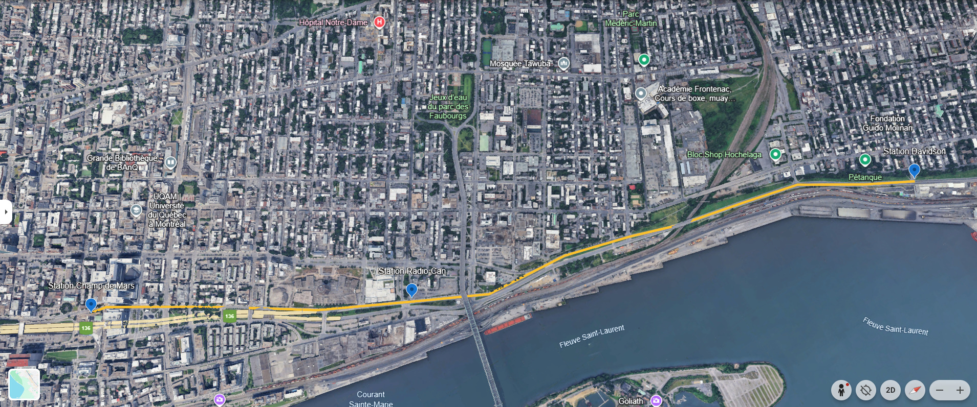 Ainsi, à partir de la station Davidson, il y aurait deux autres stations à hauteur: une à l’intersection Papineau et Viger (Radio-Canada) et une à la place Place Marie-Josèphe-Angélique, juste à côté du CHUM et de la station Champ-de-Mars.