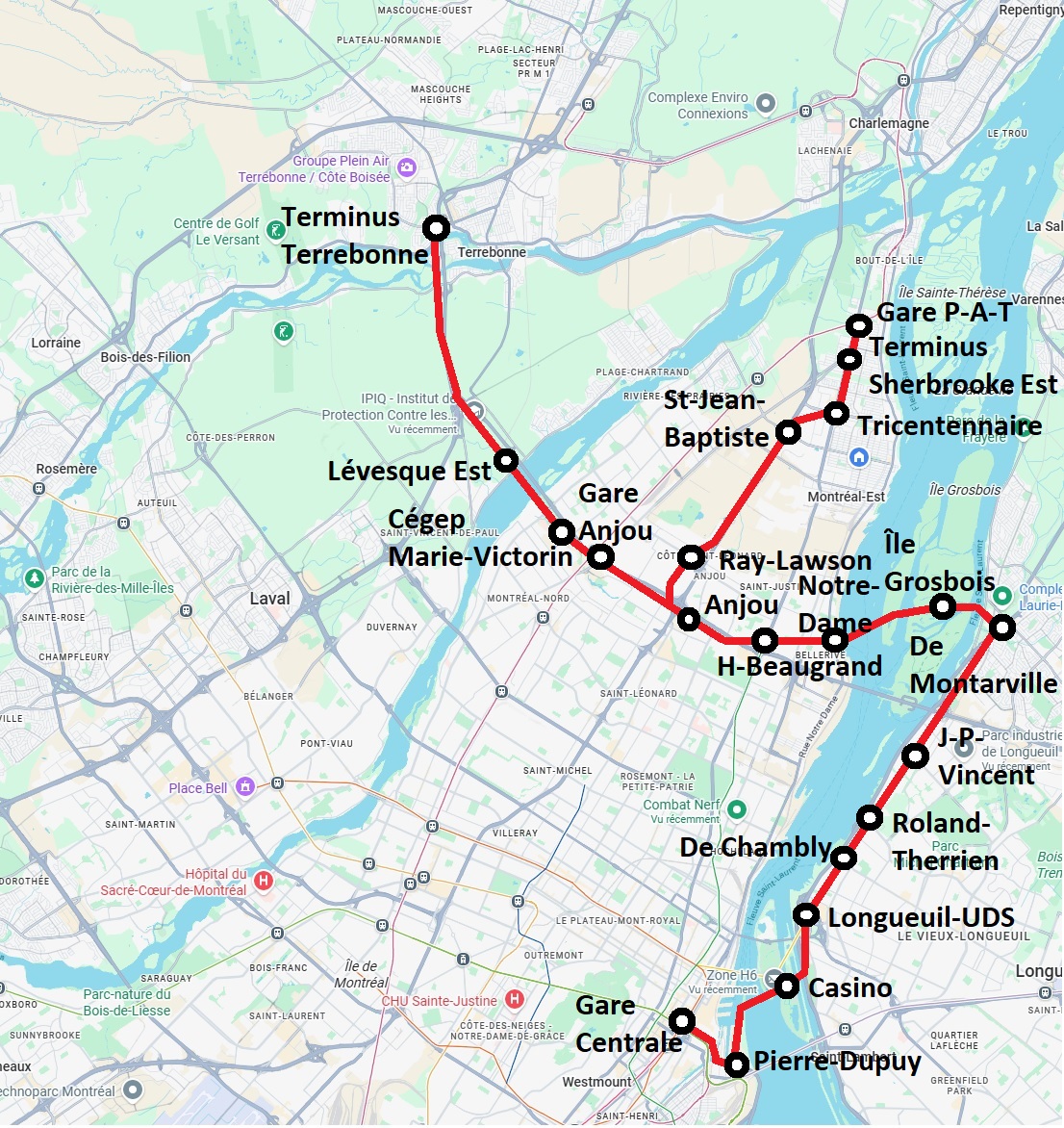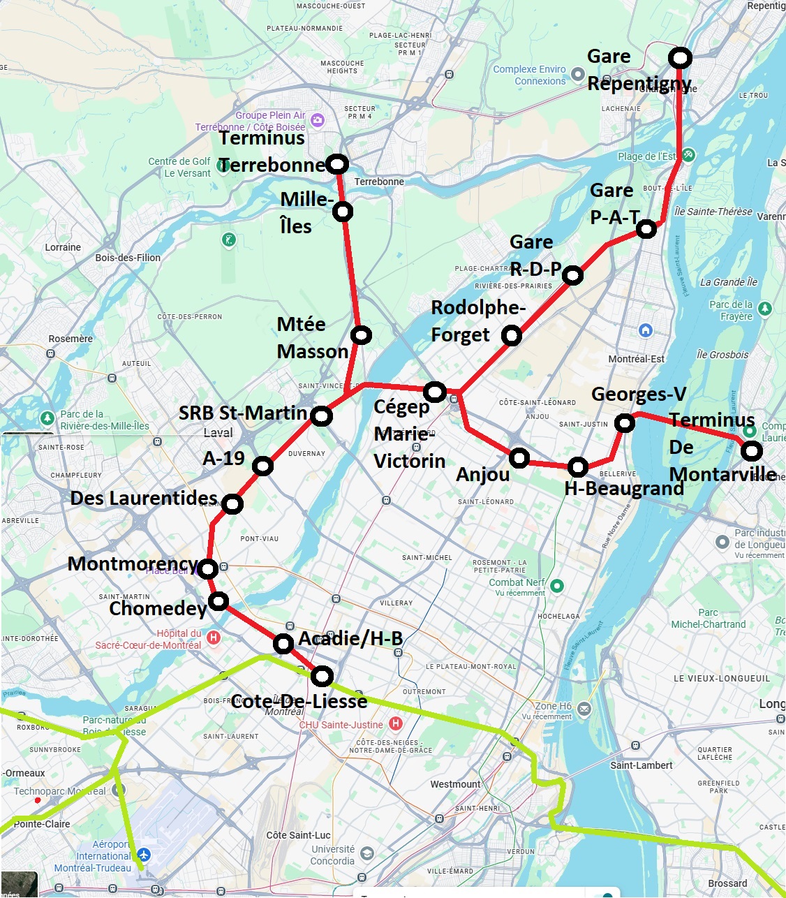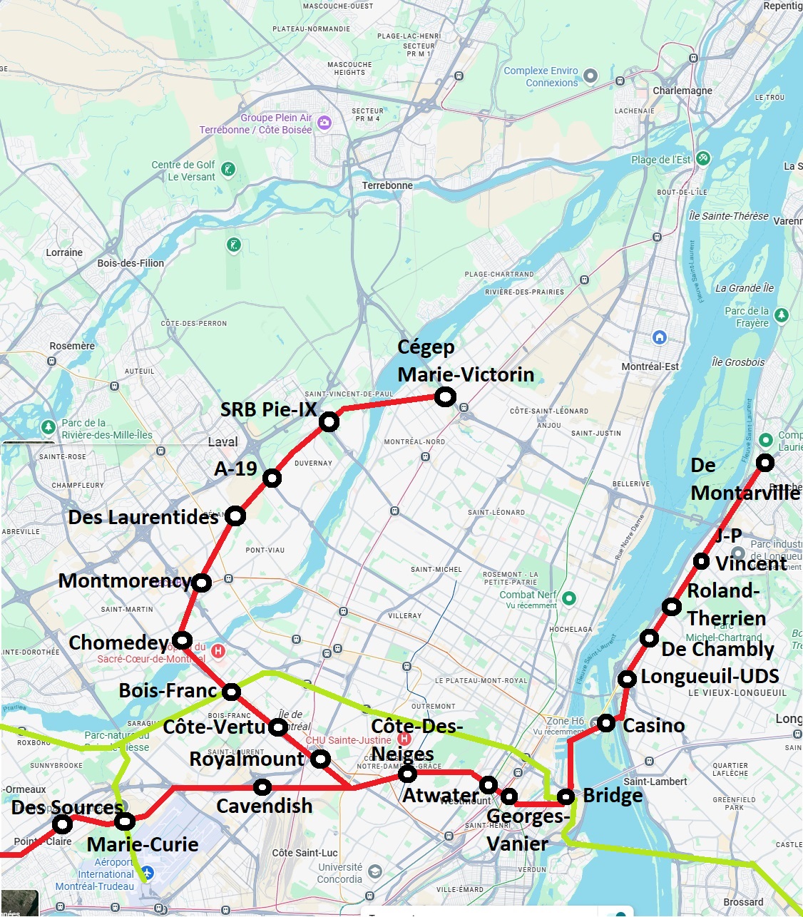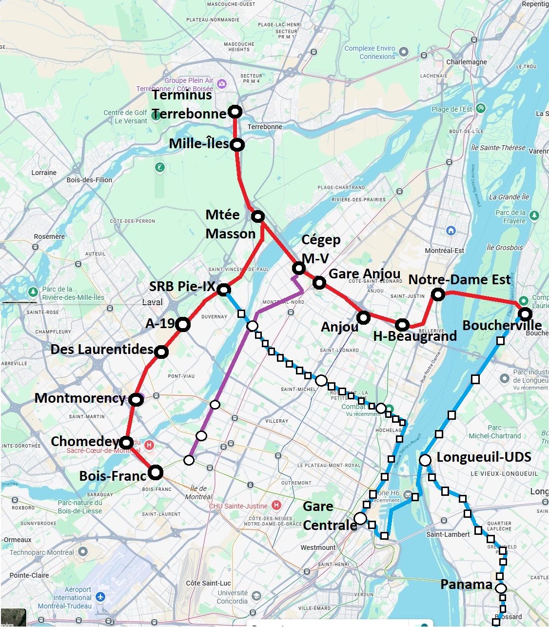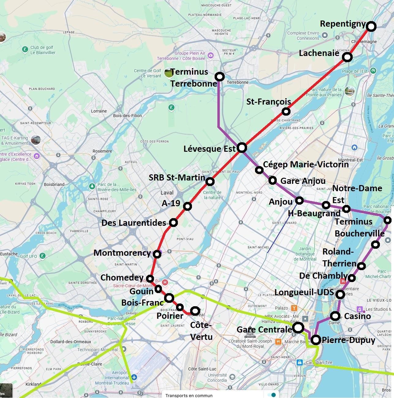 - Deux lignes de REM (rouge et violet) avec une correspondance à Laval (station Lévesque Est)