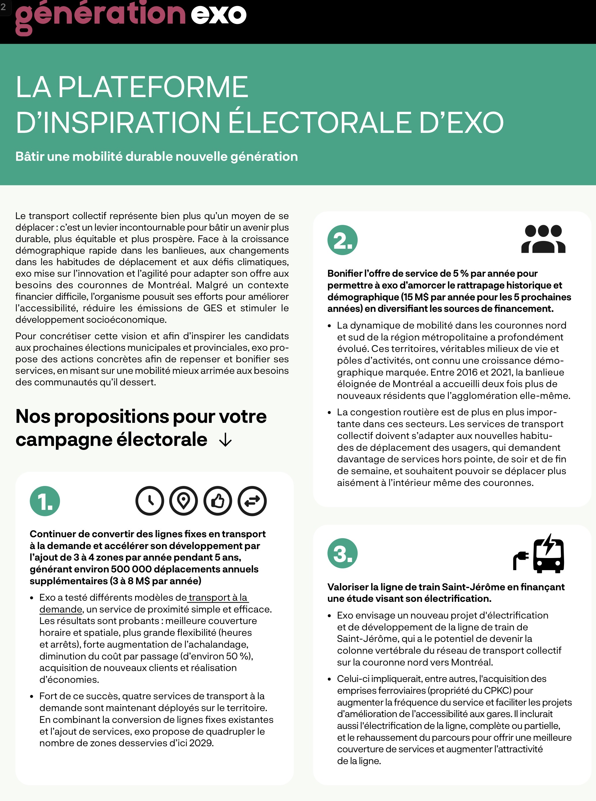 De plus, l’ARTM n’a pas de vision cohérente. Je comprends qu’elle joue entre les mains de la politique, mais un jour elle souhaite abolir certains lignes de train de banlieue et l’autre elle souhaite tous les bonifier sans prioriser une ligne sur une autre, comme indiqué dans leur Vision 2050. La vision 2050 aurait dû mettre quelque chose qui semble à une ordre de priorité, comme la ligne de train exo 12, où exo l’a mis dans leur plateforme politique comme un projet prioritaire.